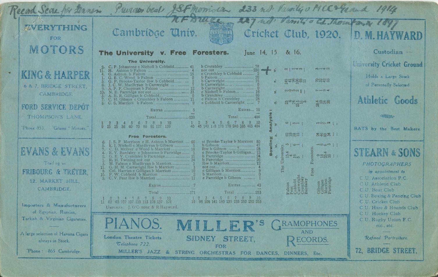 Official cricket scorecard from the game played at Fenners on June 14-16, 1920. The University won comfortably after Hubert Ashton scored 236* in the second innings. This was the record individual score at Fenners and there is an ink note recording this to the top of the scorecard (with previous best scores).