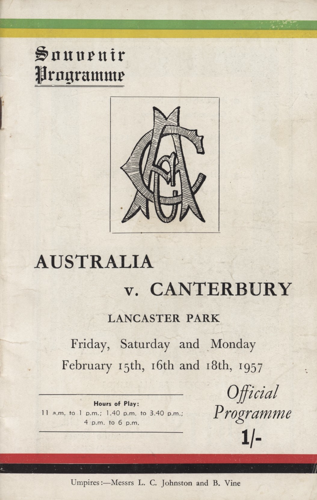 CANTERBURY V AUSTRALIA 1957 (LANCASTER PARK) CRICKET PROGRAMME