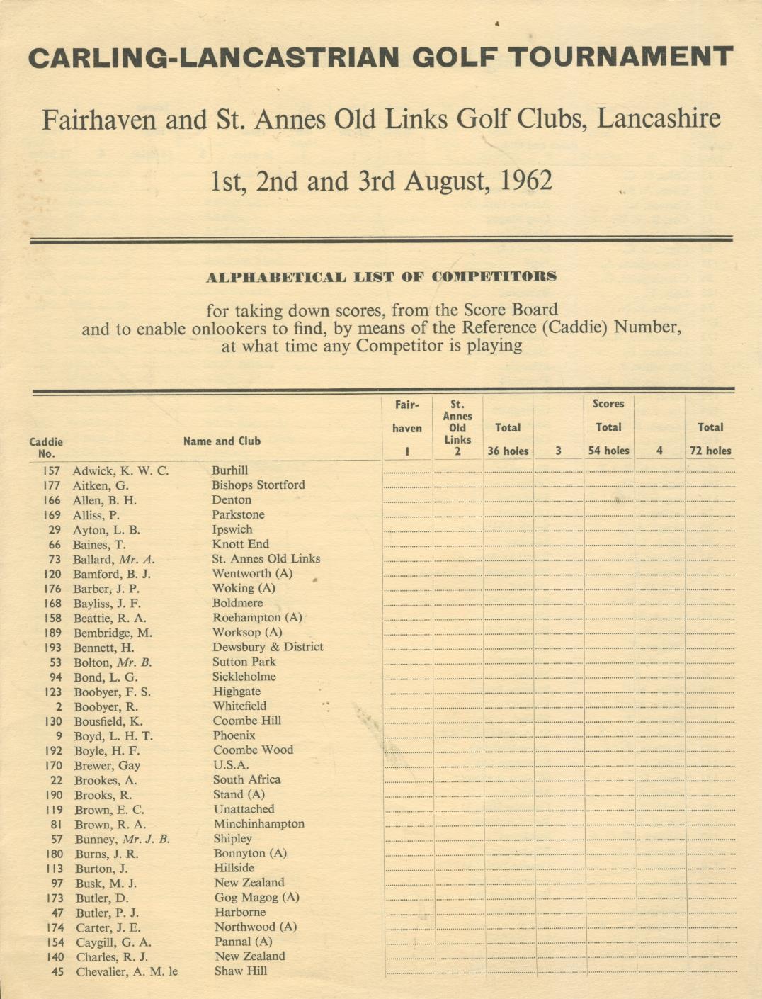 CARLING-LANCASTRIAN GOLF TOURNAMENT 1962 - COMPETITORS LIST