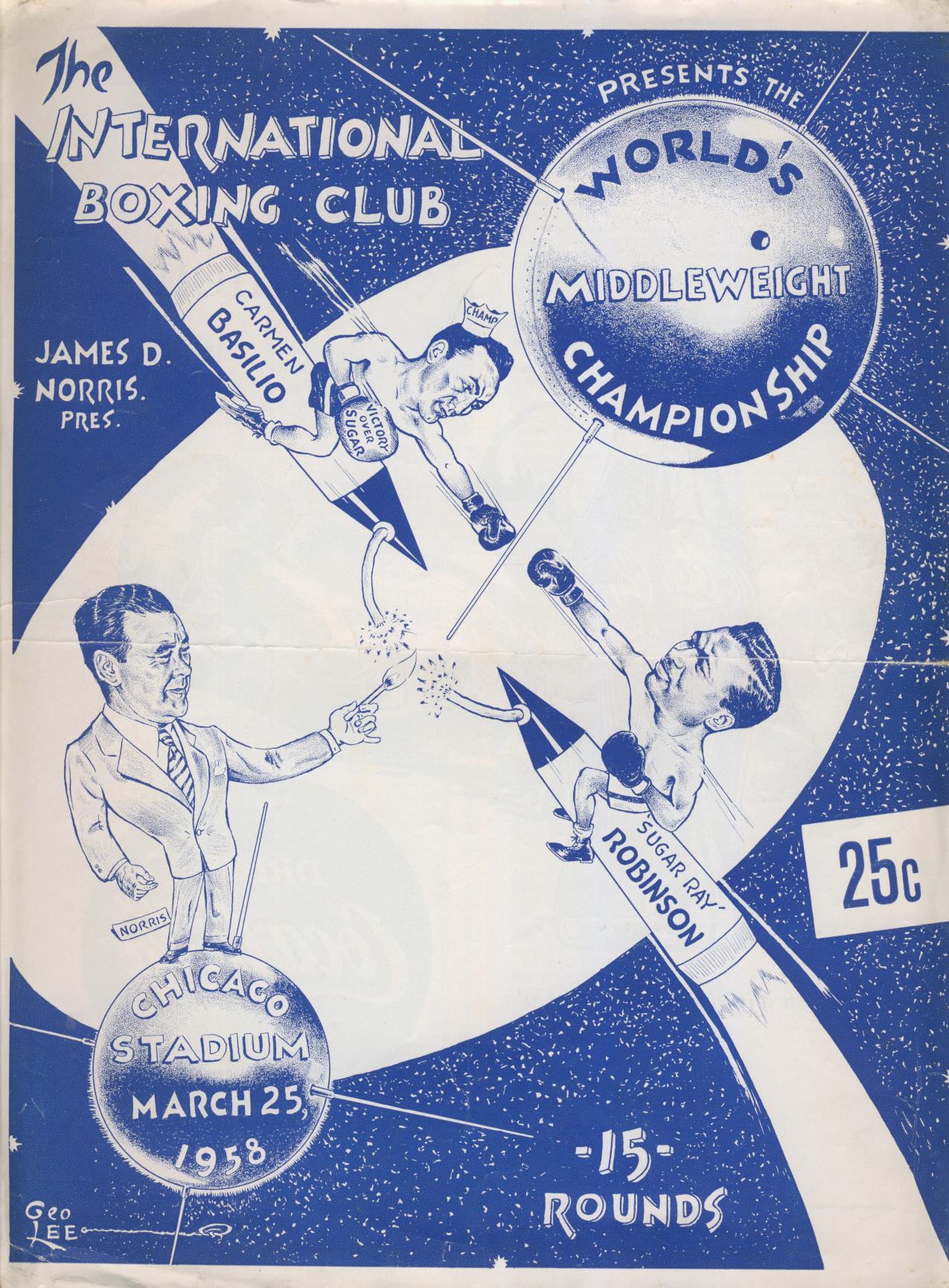 Official souvenir program for the World Middleweight Championship fight, held at the Chicago Stadium on March 25th, 1958. Robinson regained the World Championship, to become the first ever boxer to win a divisional World Championship five times.