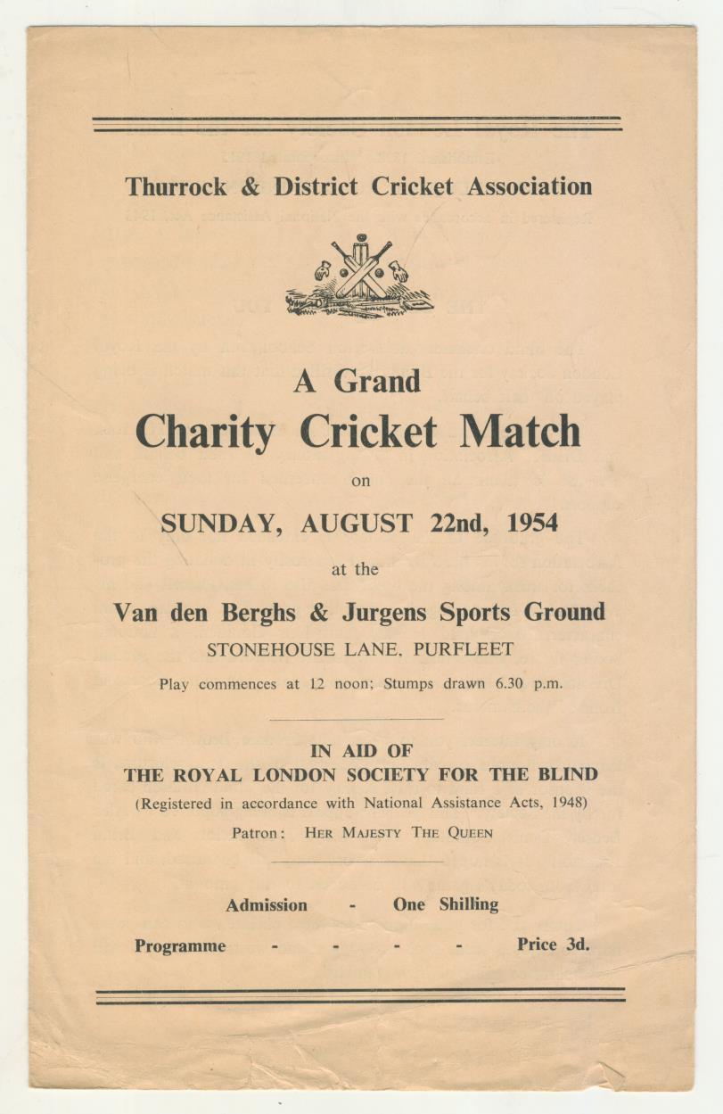 Official programme for a charity cricket match played at Purfleet on August 22nd, 1954. The celebrities team was put together by H.A. Purcell and included many great West Indian cricketers, including George Headley, Alf Valentine, Vincent Valentine and J Cameron. Other celebrities included MacDonald Hobley and Len Goulden.