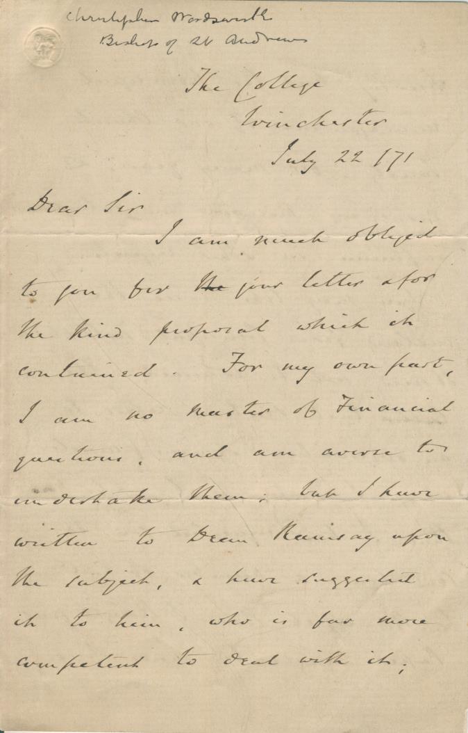 Original handwritten letter from Charles Wordsworth, the Bishop of St. Andrews, to an unknown recipient, dated 1871 and sent from Winchester College. The contents seem to relate to matters of the church. Wordsworth was the nephew of the poet William Wordsworth and was a noted rower and cricketer at Harrow and Oxford. He is widely credited with instigating the very first Varsity cricket match in 1827, in which he played and captained Oxford, and also the very first Boat Race in 1829, in which he also participated. A true giant in the history of sport.