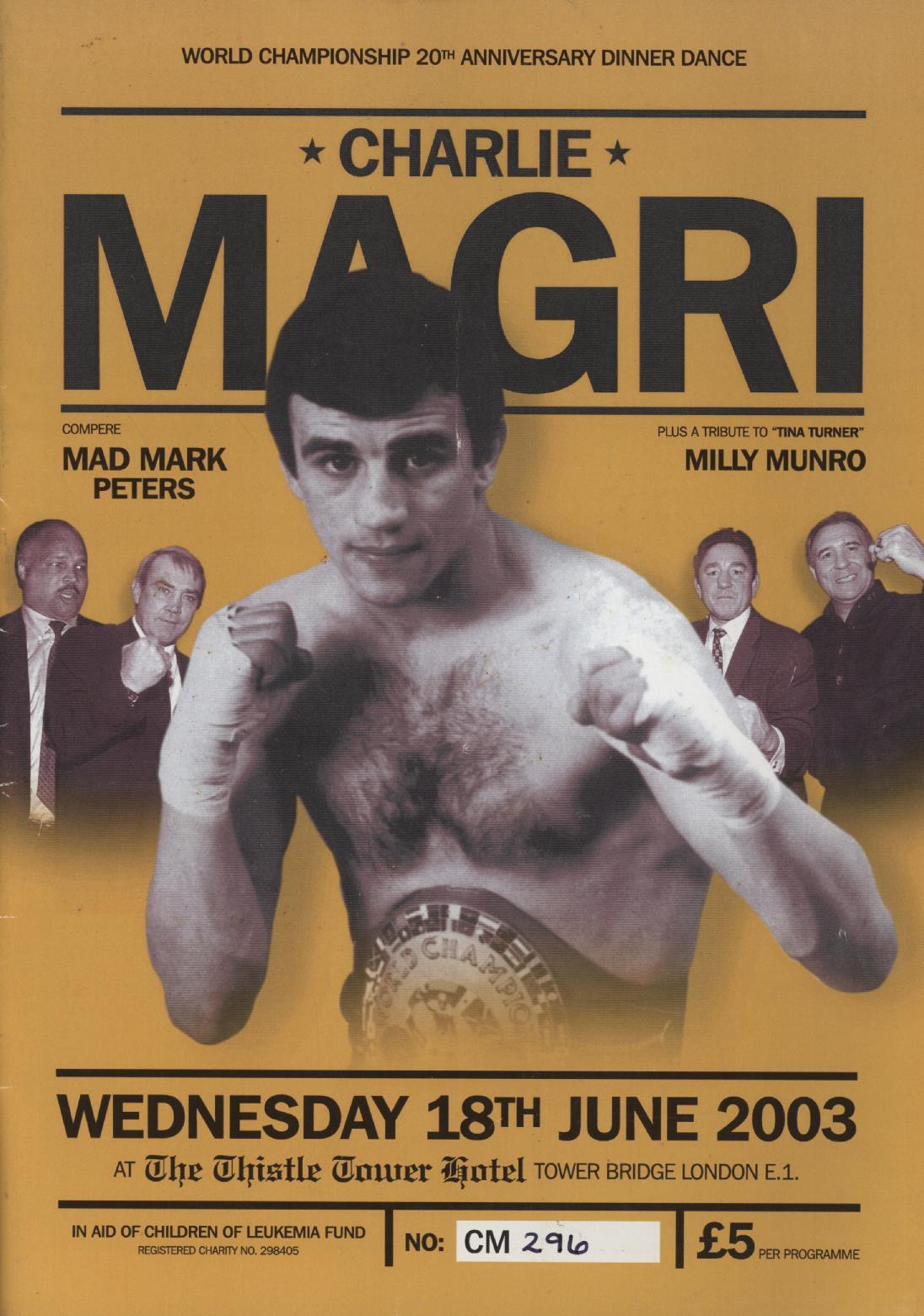 Programme for the charity evening at The Whistle Tower Hotel, London on 18 June 2003 commemorating the anniversary of Magri's WBC Flyweight win and raising money for the Children of Leukemia Fund. Guests include Alan Minter, Dave Boy Green, John Conteh and John H Stracey.