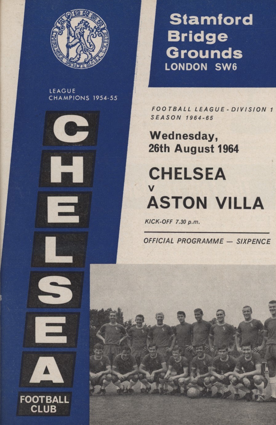 A set of 27 home first team matches for Chelsea's 1964-65 season (20 League, 3 FA Cup, 4 League Cup, including final). The home league match v Leeds United is missing and there are two copies of the match v Everton. The League Cup match v Notts County is not included. In addition there is the International Club Match v Benfica (29 in total).