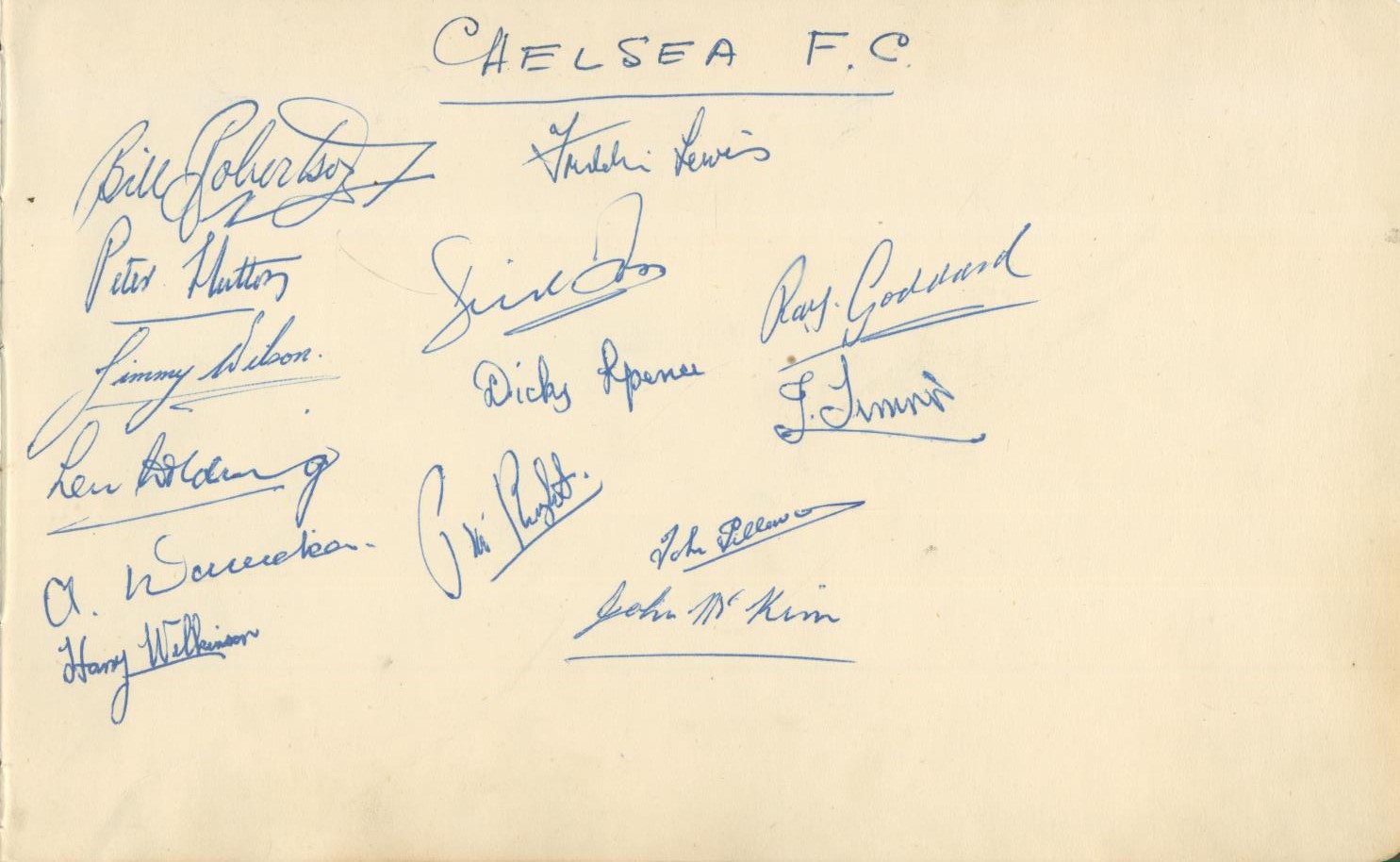 Large album page.Signed very nicely in ink by 14 Chelsea players, including Lewis, Robertson, Dolding, Goddard, and Spence.