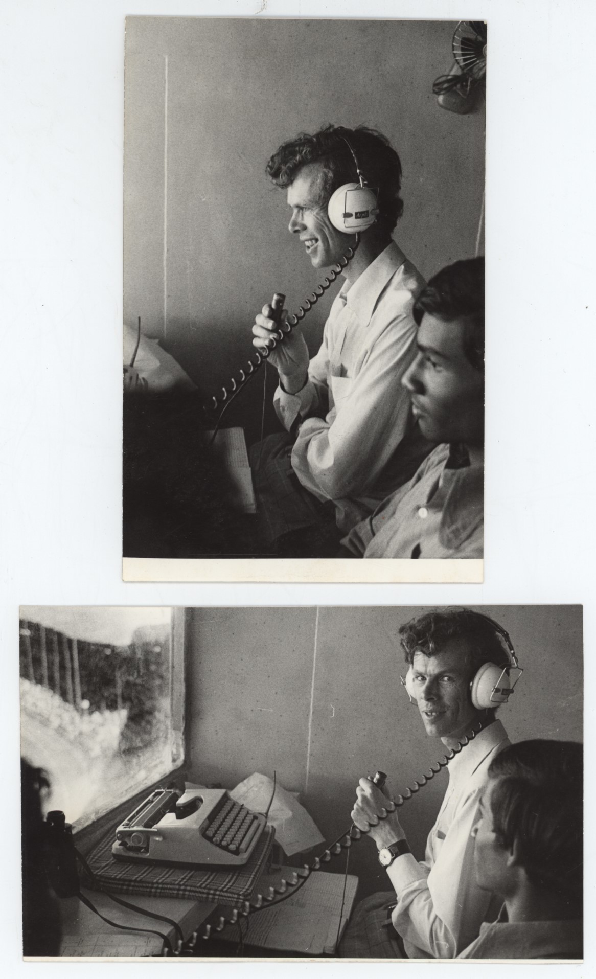 Two original photographs of Christopher Martin-Jenkins commentating a cricket match in India (probably Bangalore).