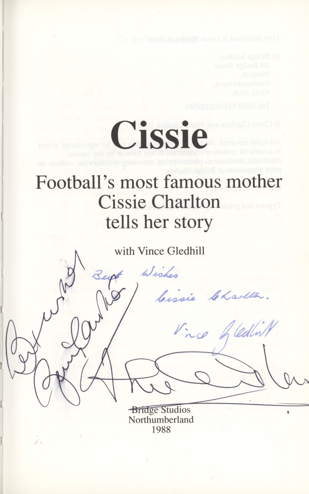 First edition. 8vo.183pp. Dust-wrapper, very good. Signed nicely by Cissie Charlton and Vince Gledhill to title-page. Also signed by Jackie and Bobby Charlton to same page.