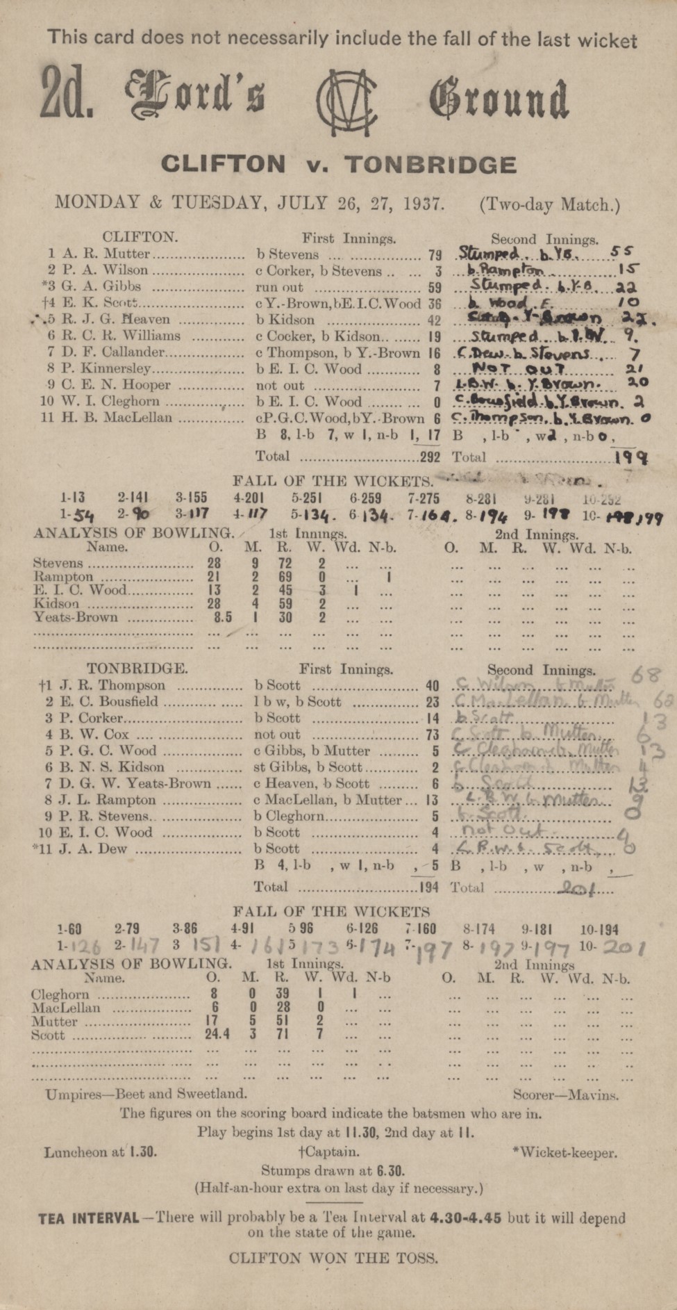 CLIFTON V TONBRIDGE 1937 CRICKET SCORECARD
