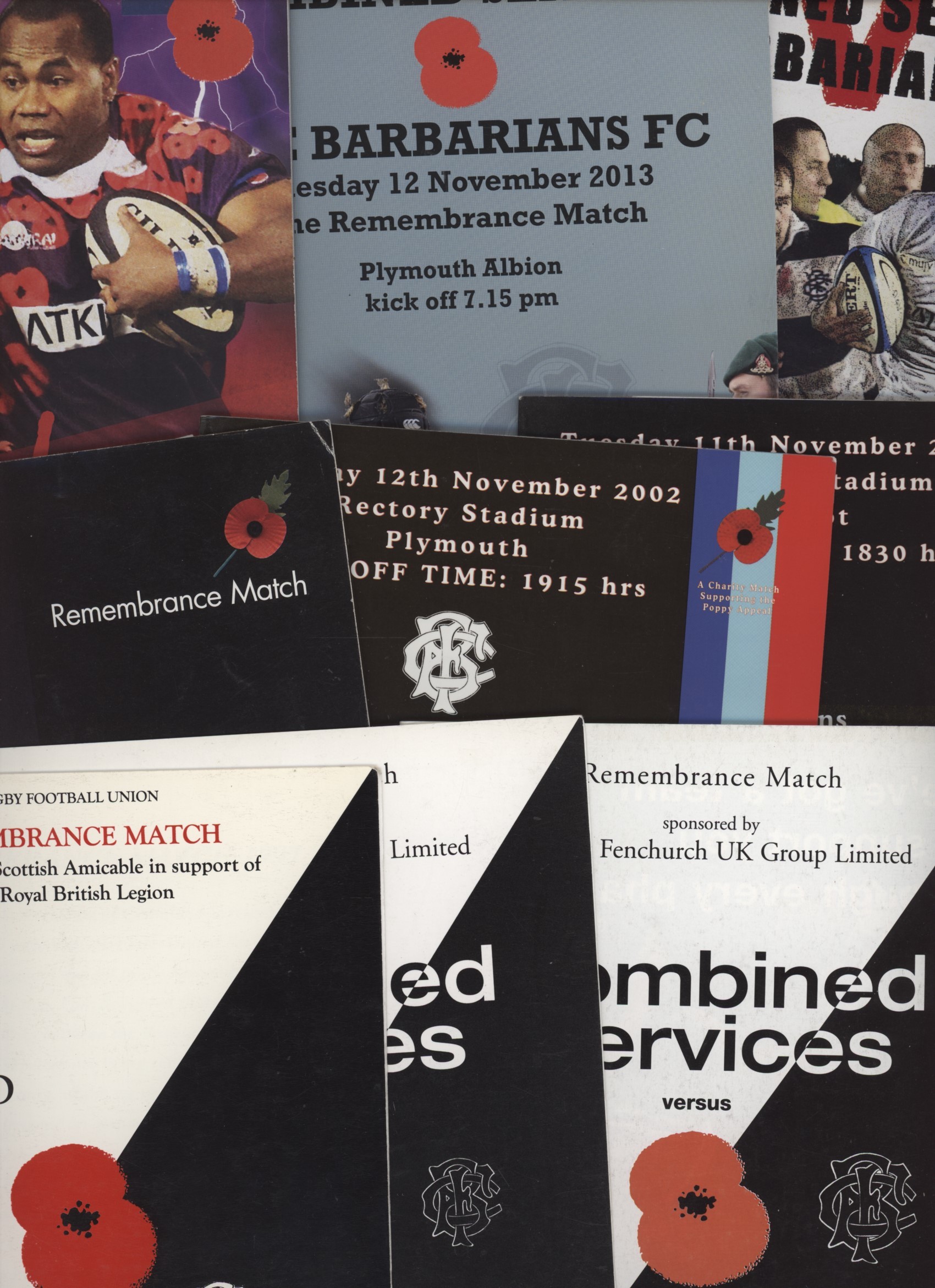 A collection of 14 programmes for the Remembrance Match between Combines Services and The Barbarians. The years are 1997, 98, 99, 2001, 02, 03, 04, 05, 06, 08, 09, 10, 13 and 14.