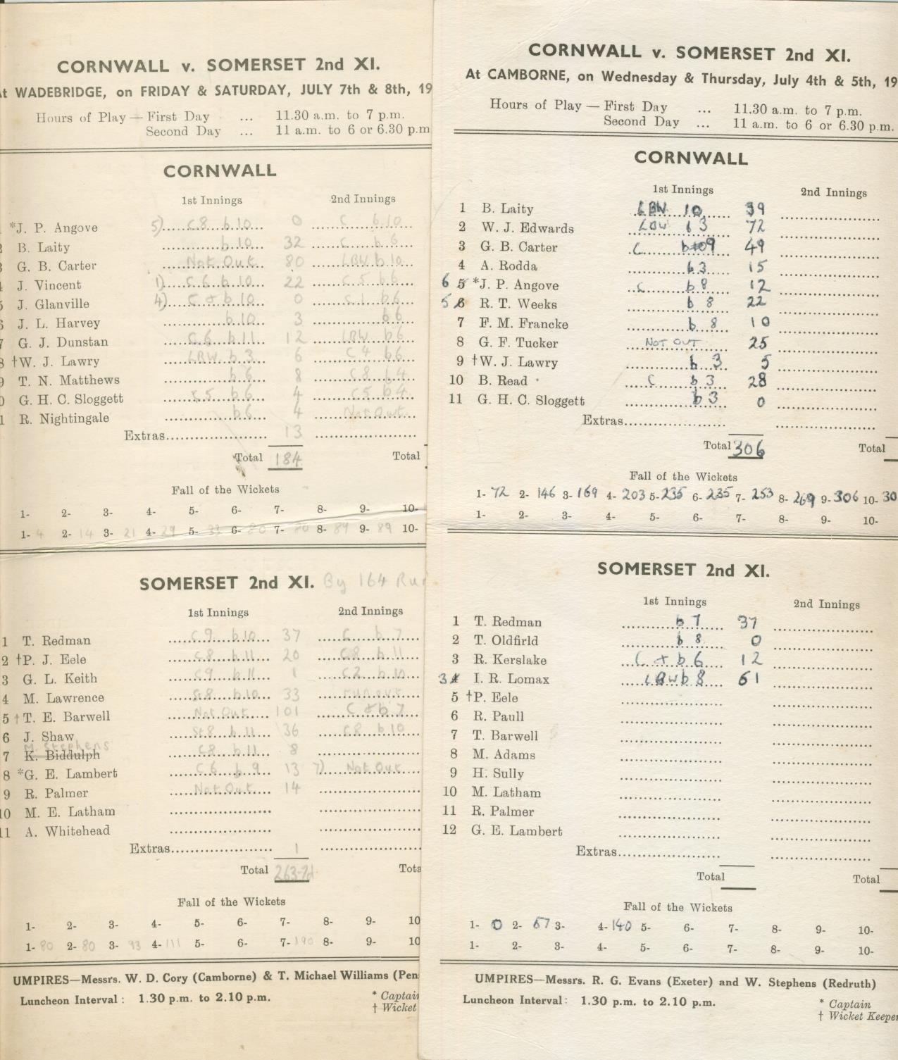 Cricket » Cricket Scorecards » Minor Counties/Clubs » CORNWALL V SOMERSET 2NDS 1961 & 1962 CRICKET SCORECARDS (2)