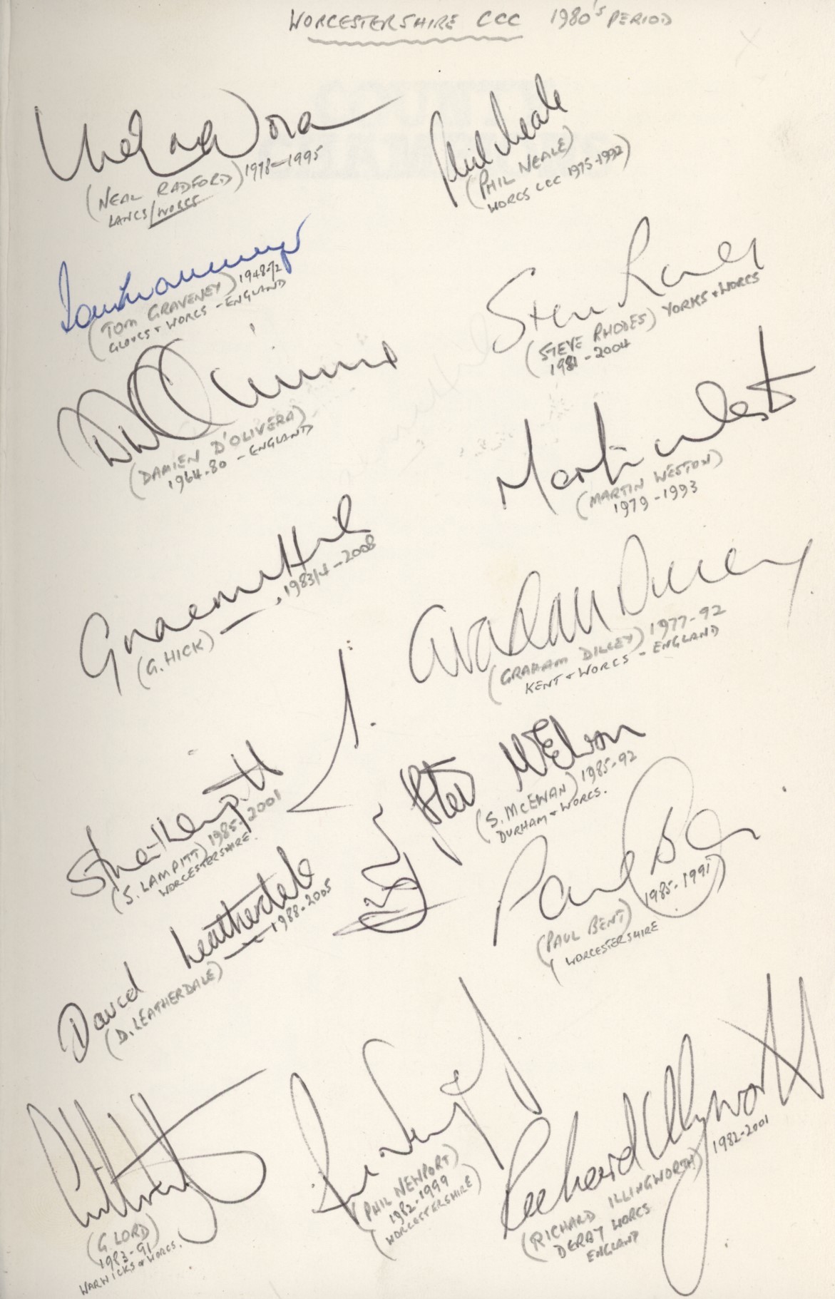 8vo. Dust-wrapper, good. Signed to the fly-leaf by 16 Worcestershire cricketers, all but two of whom were part of Worcestershire's back to back wins in the County Championship in 1988 and 1989. The autographs include Radford, Neale, Botham, Hick, Lampitt, Leatherdale, Lord, Newport, Rhodes, Weston, Dilley, McEwan, Bent and Illingworth. Also signed by Tom Graveney and Damien D'Oliveira.