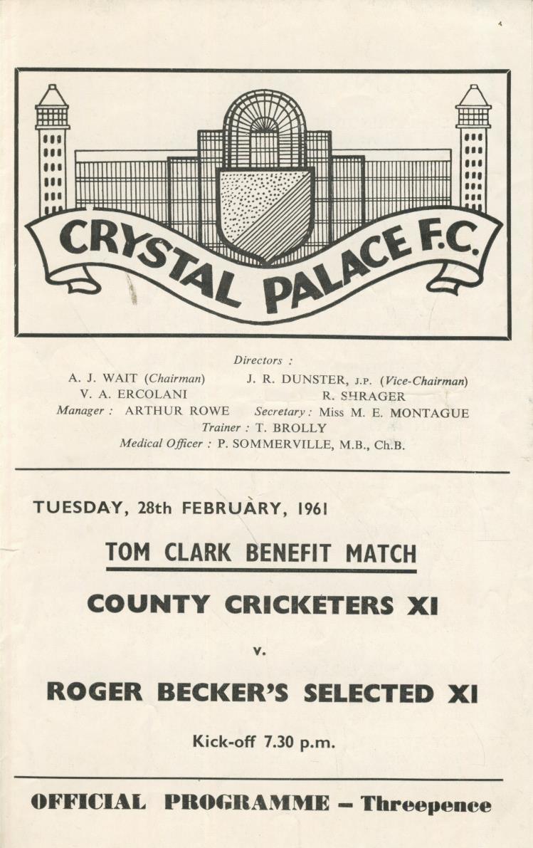 Cricket » Cricket Programmes » Other Cricket Matches » COUNTY CRICKETERS XI V ROGER BECKER'S XI 1961 (CRYSTAL PALACE) FOOTBALL PROGRAMME - TOM CLARK BENEFIT MATCH