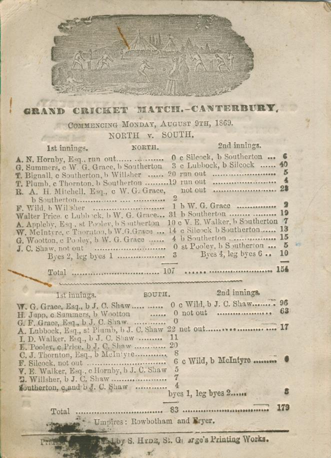 Original scorecard for the cricket match played at Canterbury on August 11-12, 1869. WG Grace scored 127, becoming the first person to score a century before lunch on the first day of a match. The MCC won by an innings and 88 runs. On the reverse is the scorecard for the previous match during Canterbury Cricket Week - North v South, played on August 9-10. The South won by 8 wickets thanks to WG Grace's 96 (from an opening partnership of 134 with Jupp) in the second innings. Both teams were packed with famous names. The North v South card is fully printed and the Kent v MCC card is printed up to the fall of Kent's 4th wicket in the second innings (31-4). The final scores are recorded neatly in pencil in a contemporary hand.