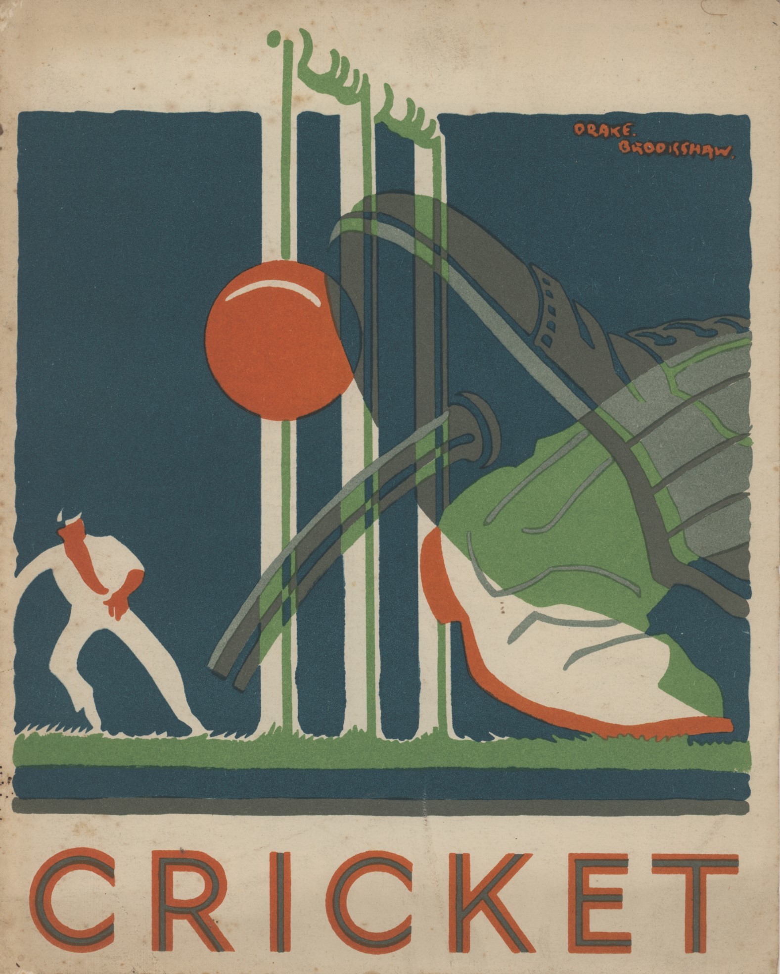 Lovely inter-war promotional brochure issued by Shell featuring 5 chromolithographs by Drake Brookshaw, not including the cover, and corresponding short essays by The Telegraph sportswriter Colonel Philip Trevor. Including memoirs of playing with Gilbert Jessop. Probably published to coincide with the 1930 Ashes series.