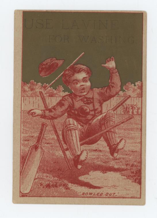 Advertising trade card from the 1880s for Hartford Chemical Company, Hartford, Connecticut, advertising Lavine powdered soap. Advertisement to back and to the front is an image of a small boy playing cricket and falling over his stumps.