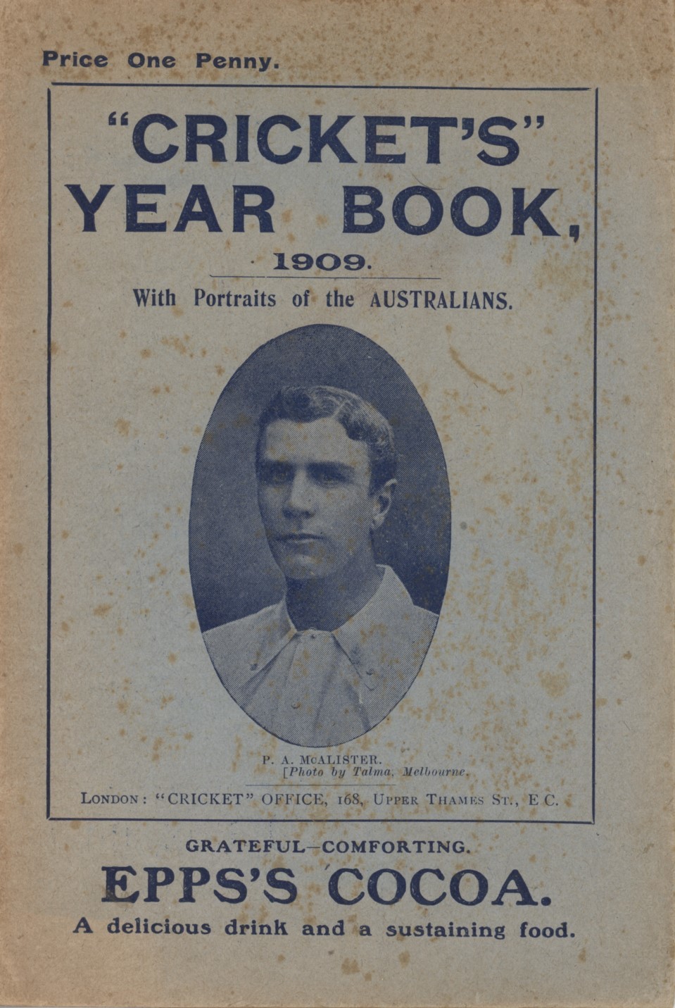 Paperback. 8vo. 20pp. 9 pictures of county teams, 16 cameo portraits of Australian players. Original illustrated paper wrappers, lightly foxed with browning to edges. Cameo portrait of P.A. McAlister to front. Good condition.