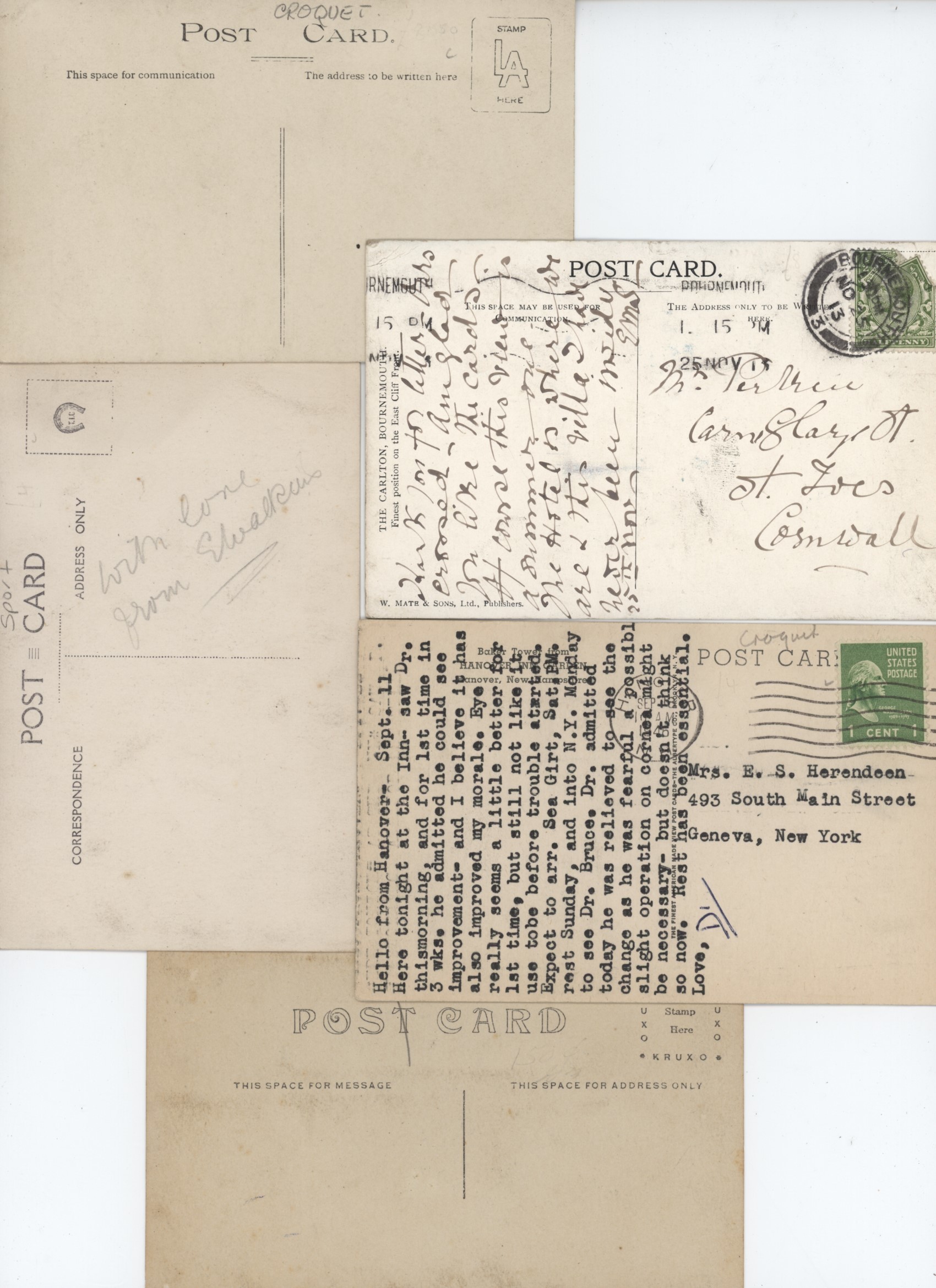 Eight postcards featuring scenes of croquet, including London and Bournemouth. All are from the early part of the twentieth century apart from one reprint from 1977. Two are postally used, one dated 1913 and the other with typed message to reverse and from the USA.