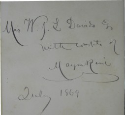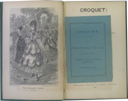 Second American Edition. 8vo. 48pp. Engraved frontis. ("The Croquet Queen"), 2 plans. Original olive green sand-grained cloth, title and vignette of a croquet set in gilt to front. Front inner hinge cracked and beginning to become exposed. Threaded into the block opp the frontis is a 16mo, 11pp pamphlet, dated 1882, entitled "Croquet - The Rules Governing The Game". Signed presentation copy from the author to a Mrs WJL Davies, dated July 1869.