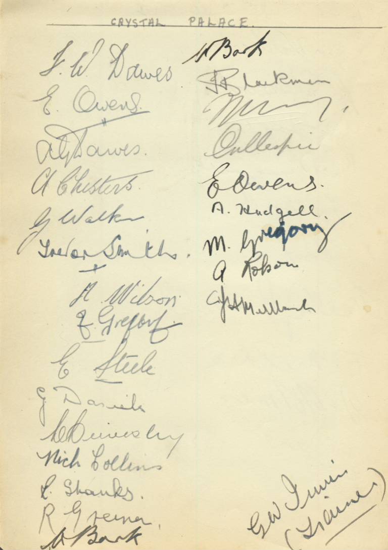 Album page. Signed in ink by 24 Crystal Palace players from the late 1930s, including FW Dawes, AG Dawes, Owens (twice), Chesters, Walker, Smith, Wilson, F Gregory, Steele, Daniels, Lievesley, Collins, Shanks, Bark (twice), Blackman, Gillespie, M Gregory, Robson, Hudgell and Irwin (trainer). On the reverse 9 Reading players and the trainer have signed, including Wallbanks, Sherwood, Russell, McPhee, Holmes and Oxberry (trainer).