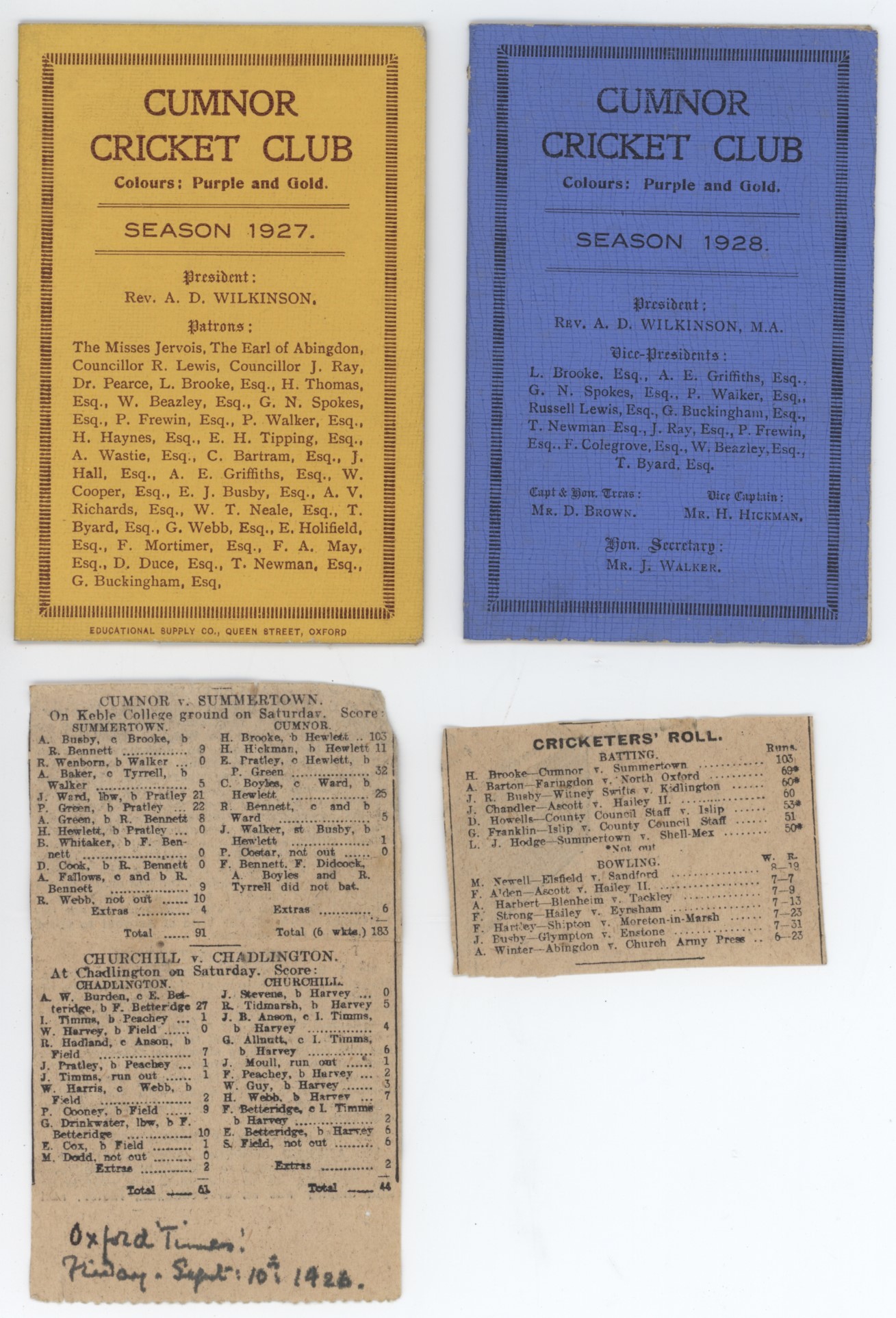 Two small fixture cards for Cumnor Cricket Club (Oxfordshire), 1927 and 1928. The cards come from the personal collection of Henry Brooke, later Baron Brooke of Cumnor and Conservative Home Secrerary from 1962-64. The cards come with a newspaper cutting for a match between Cumnor and Summertown in 1926 in which Brooke scored a century - the Cumnor CC website records that Brooke scored the very first century for the club sometime during the 1920s. It is possibly this one.