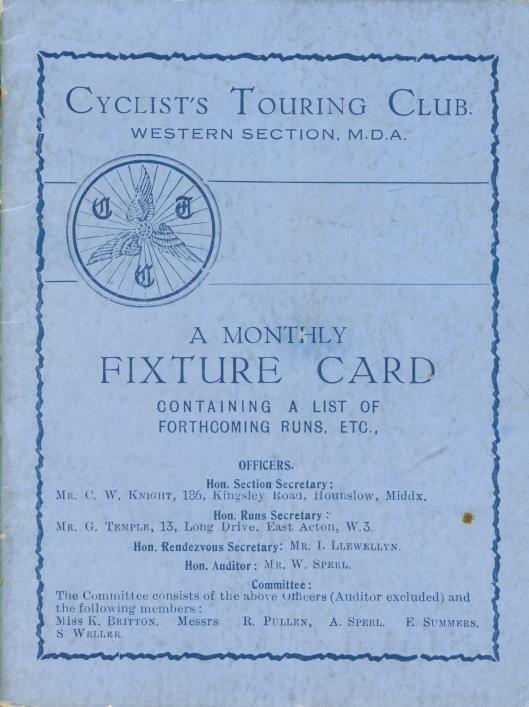 CYCLISTS' TOURING CLUB (WESTERN SECTION) FIXTURE CARD C.1930