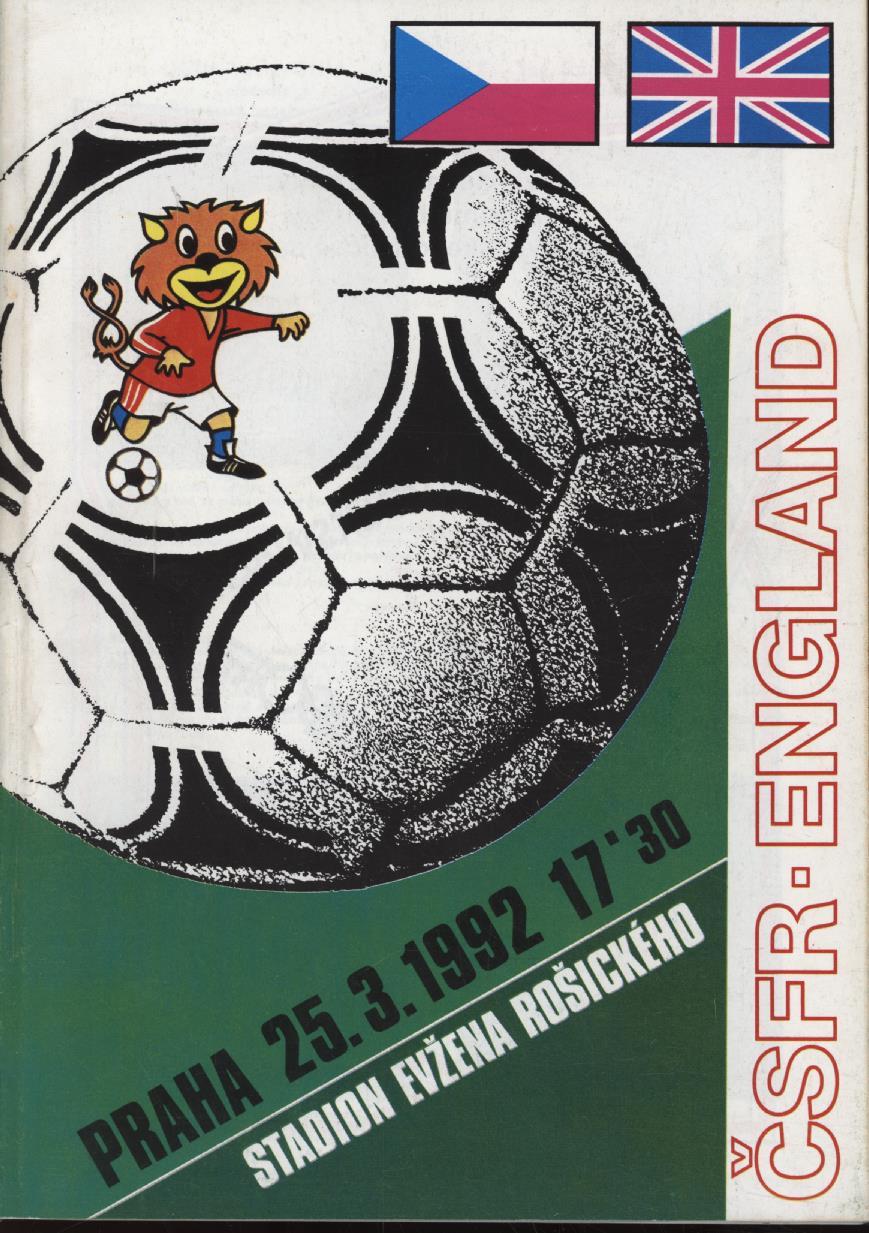 Official programme for the Czechoslovakia v England friendly match played in Prague on 25th March 1992.