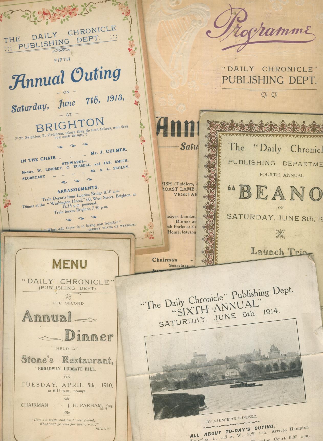 A group of five menu cards and itineraries for events organised by the publishing department of the Daily Chronicle newspaper from 1910 to 1914. These include the second annual dinner (April 5th, 1910) and annual Beanos or outings for 1911, 1912, 1913 and 1914. Places visited include Hampton Court, Brighton and Windsor.