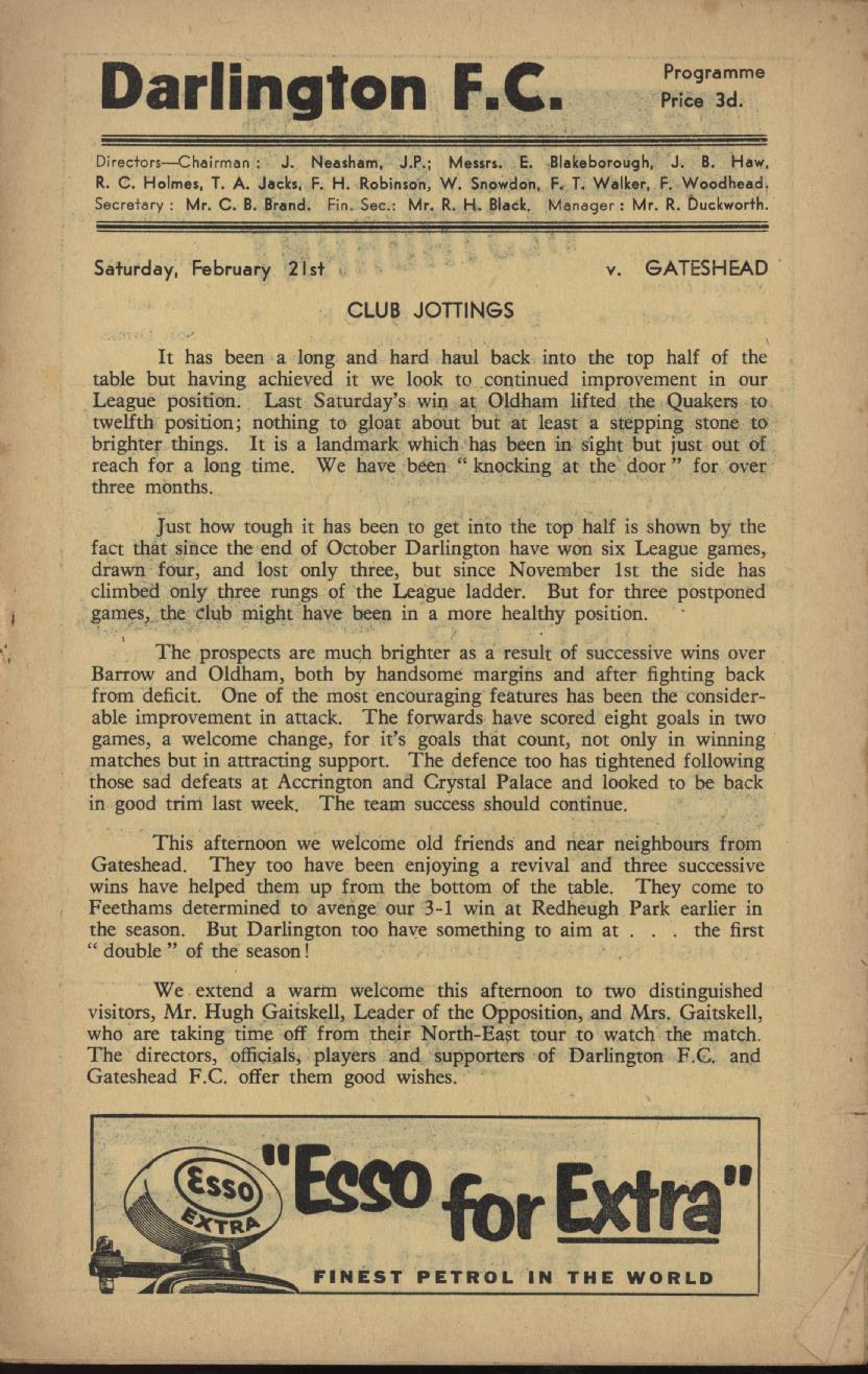 Football programme for the match between Darlington v Gateshead on 21st February 1959.
