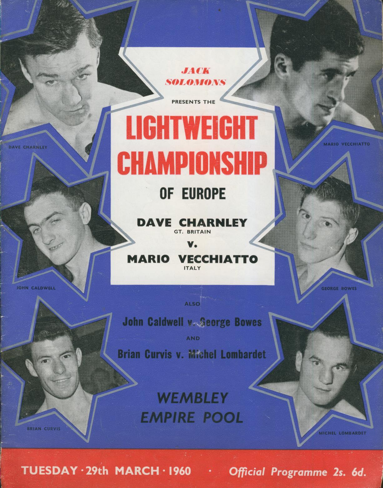 Official programme for the European lightweight title fight at Wembley, 29 March 1960. John Caldwell, Brian Curvis also on the card.