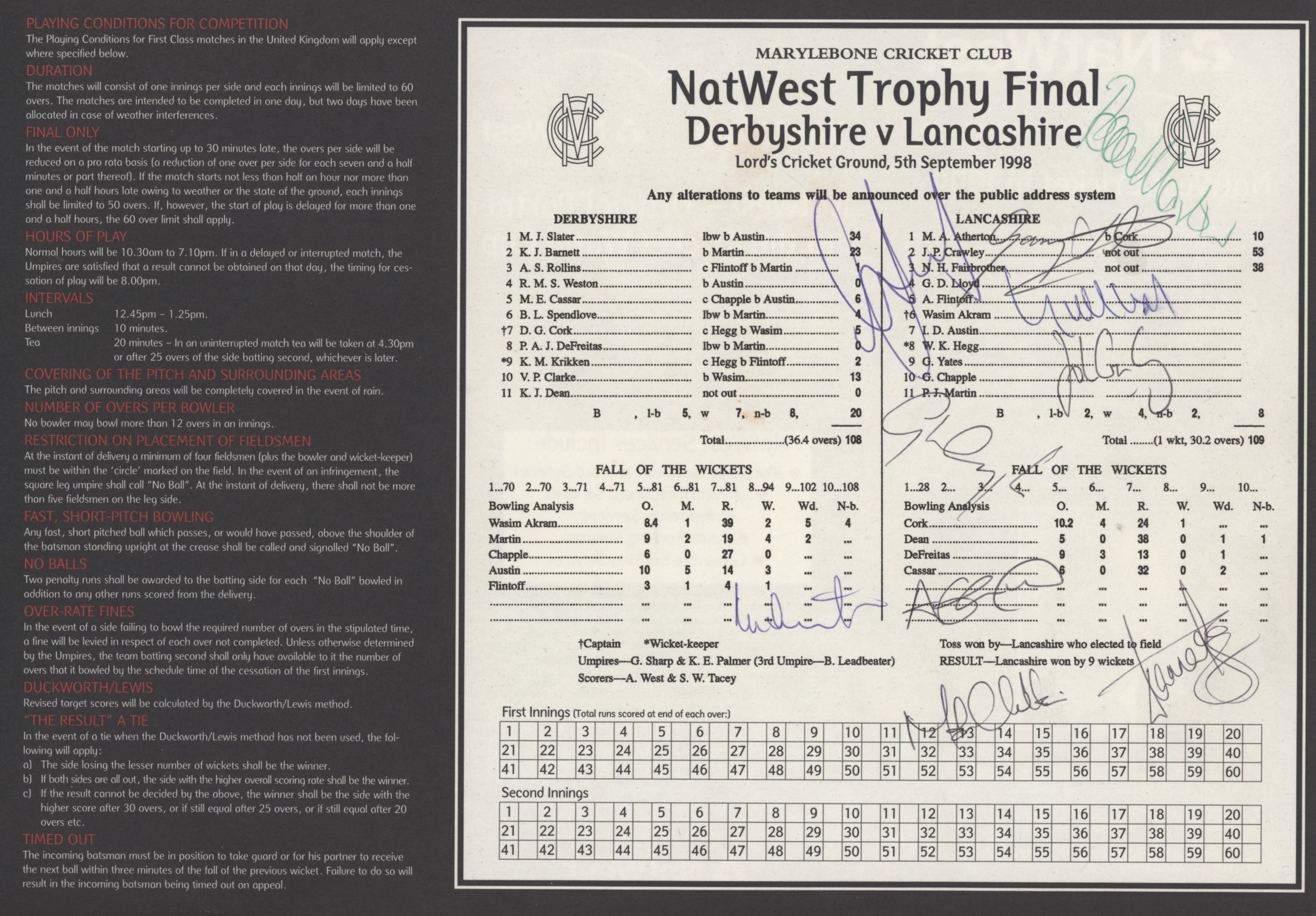 DERBYSHIRE V LANCASHIRE 1998 (NATWEST TROPHY FINAL) SIGNED CRICKET SCORECARD