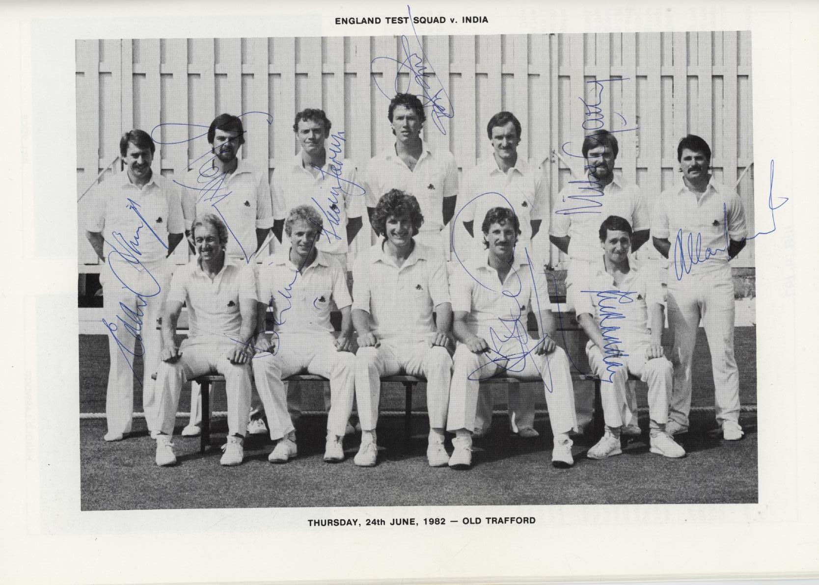 Large format paperback. Pictorial glossy card covers. 56pp. A very good copy. Signed nicely by Randall on first page. Signed to the photograph of the England team to play India at Old Trafford in 1982 by 9 members of the team - Hemmings, Miller, Jarvis, Pringle, Gatting, Lamb, Gower, Botham and Randall. Also signed within by Alec Bedser, Dickie Bird (twice), Bernard Thomas (physio), John Birch, Tim Robinson and Ken Taylor.