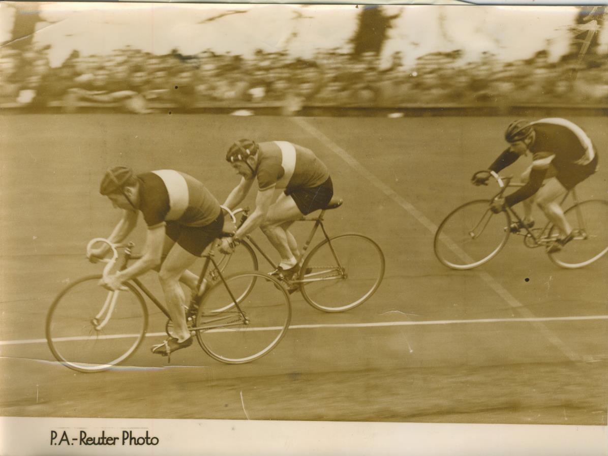 Original Press photograph of the Easter cycling meeting, held at Herne Hill on April 4th 1947, and organised by the Southern Counties Cycling Union. The photograph shows the second heat of the International Sprint Match, including Ray Pauwels (Belgium), Cor Bijster (Dutch Champion) and Reg Harris (British Champion).