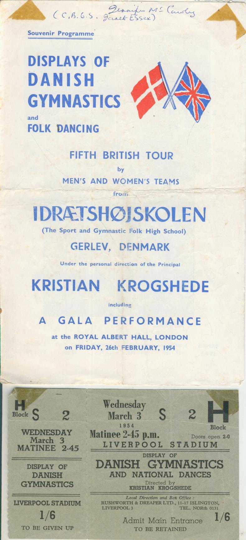 Official programme for a display of Danish gymnastics and folk dancing by the men's and women's teams from Idraetshojskolen, Gerlev, Denmark. This was their fifth British tour and took place at the Royal Albert Hall on February 26th, 1954. Accompanied by a ticket for another date on the tour - March 3rd, 1954, at the Liverpool Stadium.