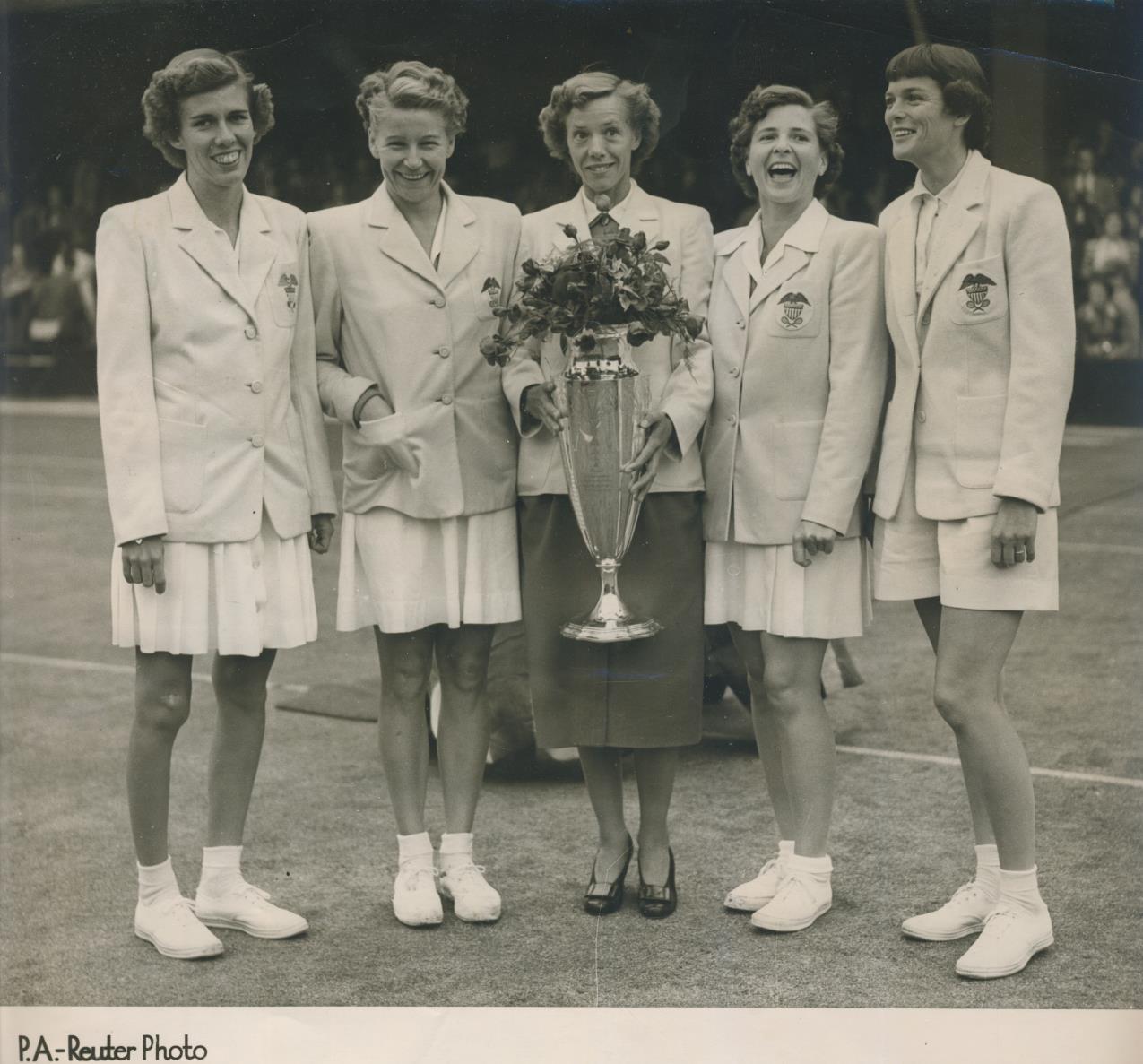 Original Press photograph of the 1950 USA Wightman Cup team (Doris Hart, Louise Brough, Midge Buck, Margaret Dupont and Pat Todd) who defeated Britain at Wimbledon on June 17th.