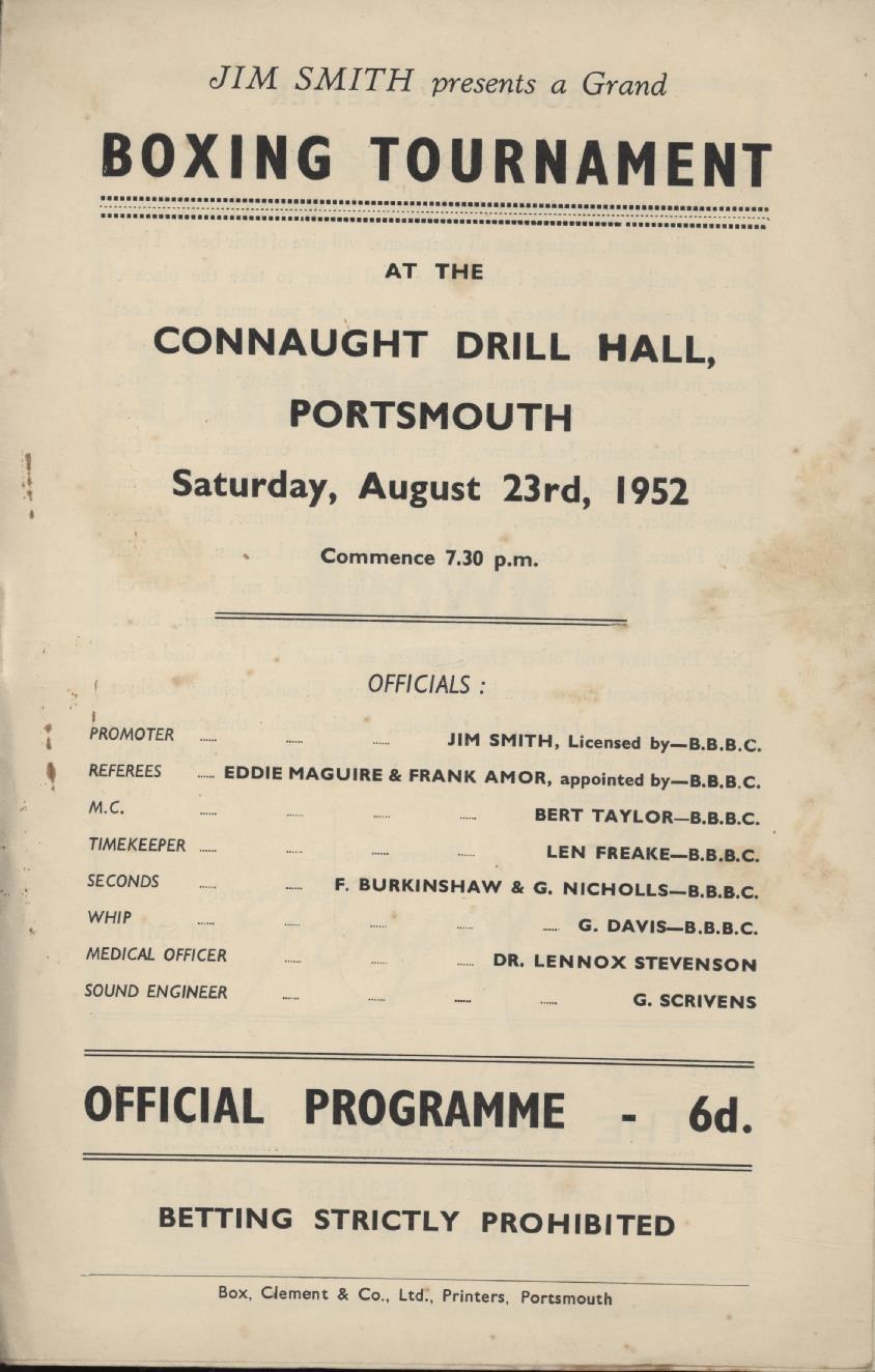 Official programme for the event staged at the Connaught Drill Hall, Portsmouth on August 23rd 1952. Other bouts included Johnny Mudge v Alf Lay, Ken Lawrence v Hughie Mackie and Johnny Cheatle v Joe Griffiths. Freddie Mills was also present at a "questions" session.