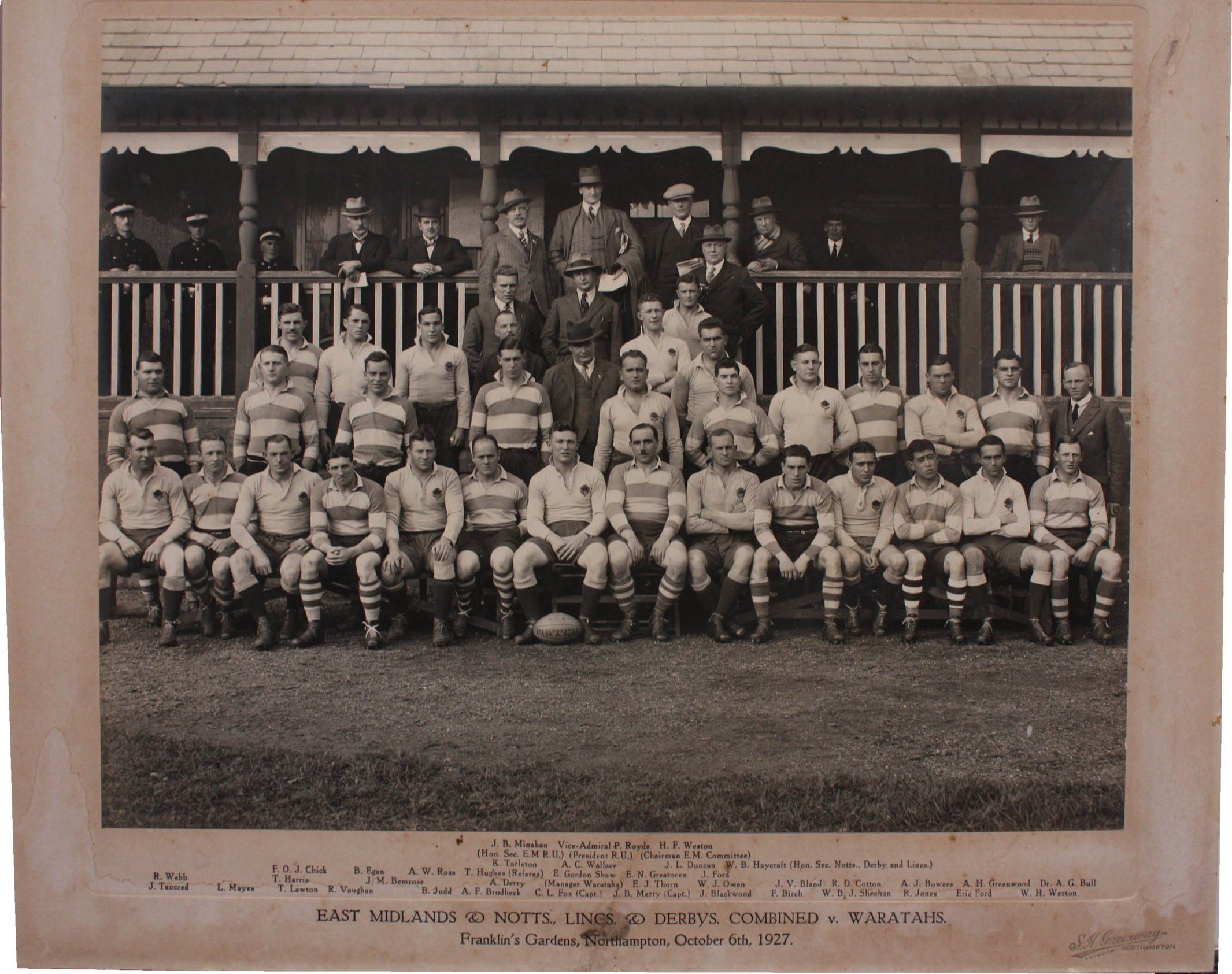 Official pre-match team photograph of the East Midlands & Notts., Lincs. & Derbys. combined XV and the Waratahs XV and their Officials from the match that was played at Franklin's Gardens on October 6th 1927 as part of the NSW side's famous tour of the United Kingdom, France and North America. They won 24 and drew two of their 31 official matches.