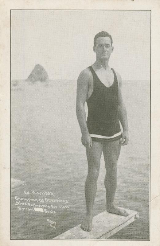 Original postcard of the champion deep sea diver of America, Ed Harrison, who managed to stay down for 3 minutes and 48 seconds. There is an advert on the reverse listing all the sea life that can be seen at Catalina.