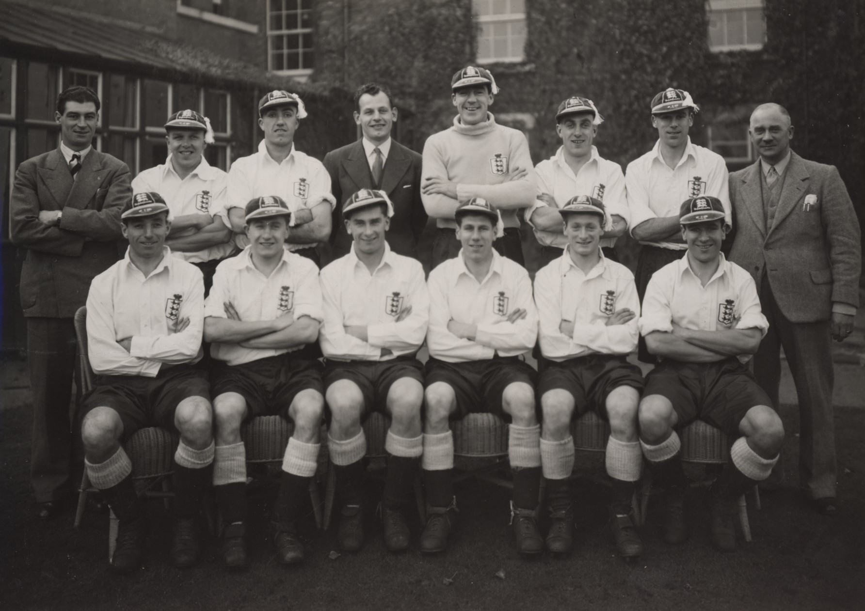 Original black and white football photograph of the England team, wearing their caps, before the match against Wales at Villa Park on November 19th 1948. Photograph by A. Wilkes & Sons, West Bromwich. England won the match 1-0 with a forward line of Matthews, Mortensen, Milburn, Shackleton and Finney!