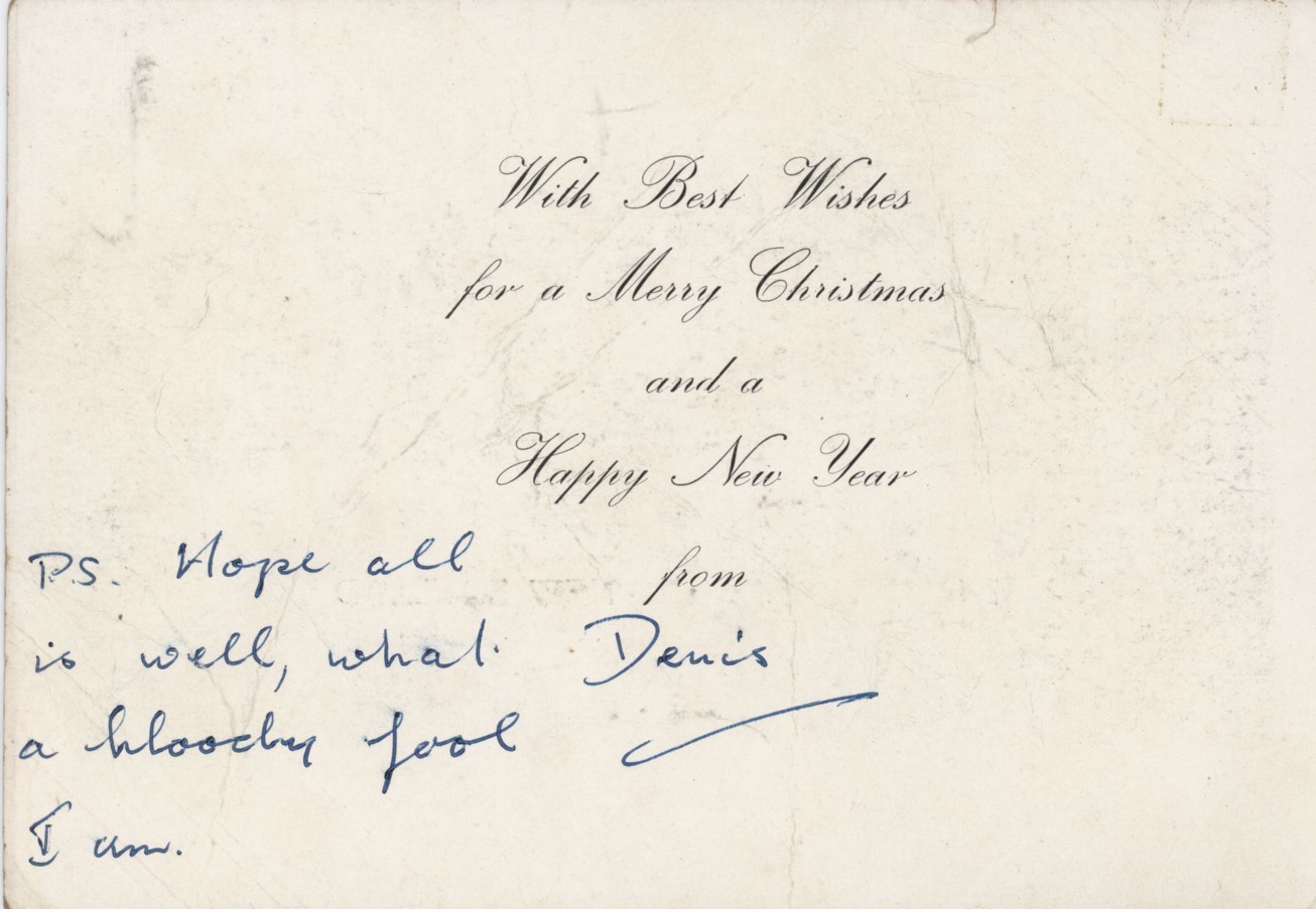 Official MCC Christmas card sent by Compton to his agent Bagenal Harvey. Compton writes "P.S. Hope all is well, what a bloody fool I am. Denis". This undoubtedly refers to the hand injury that Compton sustained in the first Test, side-lining him for the next match.