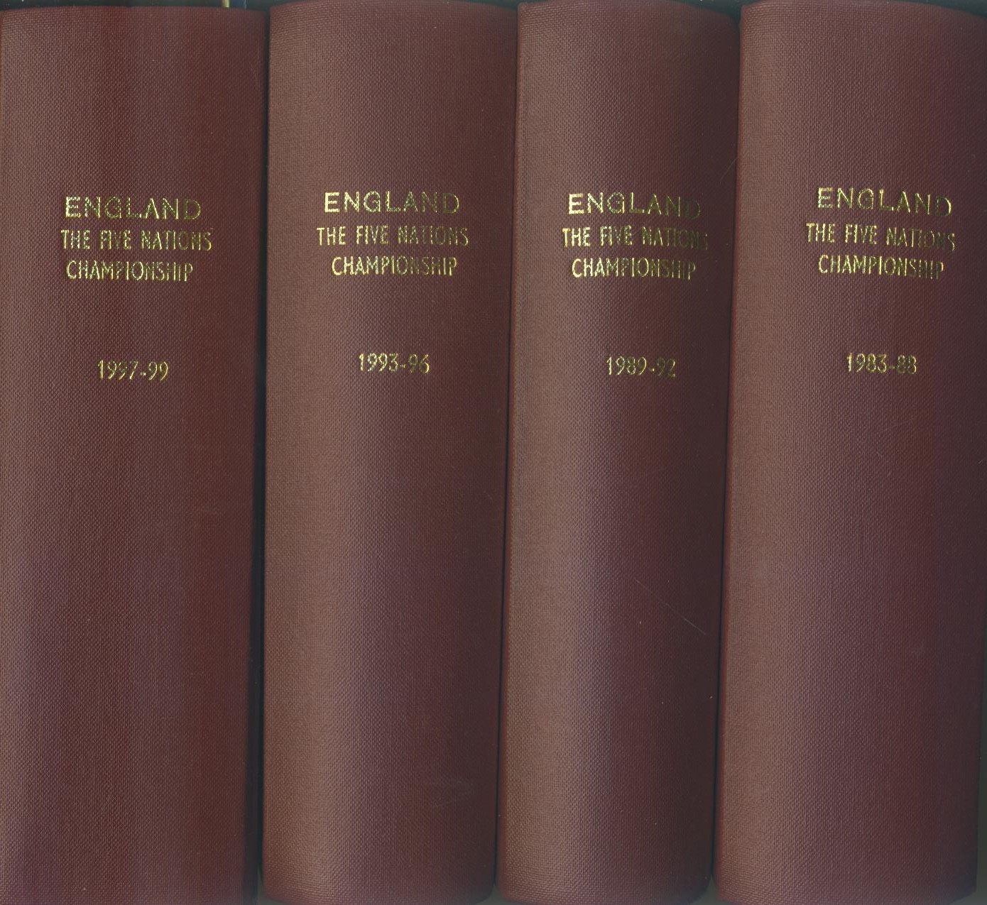 Four bound volumes of rugby programmes, containing all of England's Five Nations matches from 1983 to 1999 - 68 programmes in total, including a number of matches away in France. Typed results of each season are pasted in at the beginning of each volume. A colour photocopy of the Scotland v England match of 1998 has been bound in as the original programme was large format. A copy of the original programme is included (but not bound in).