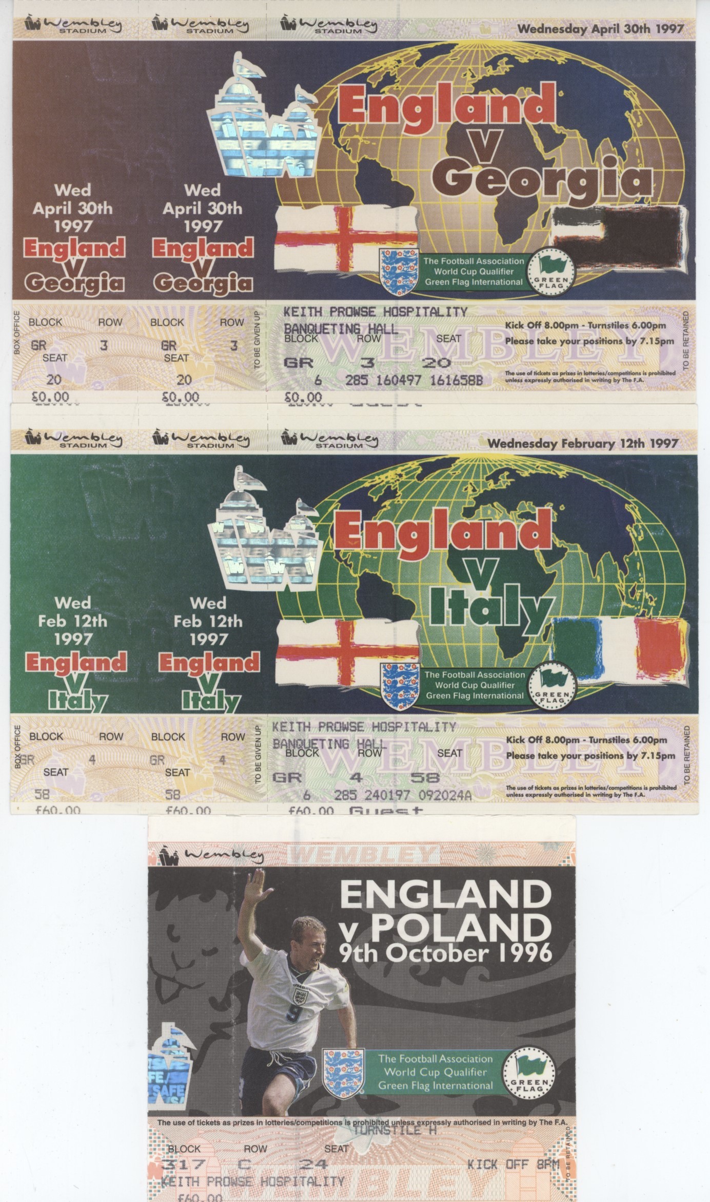 Three original tickets for matches against Poland, Italy and Georgia, all played at Wembley in 1996 and 1997.