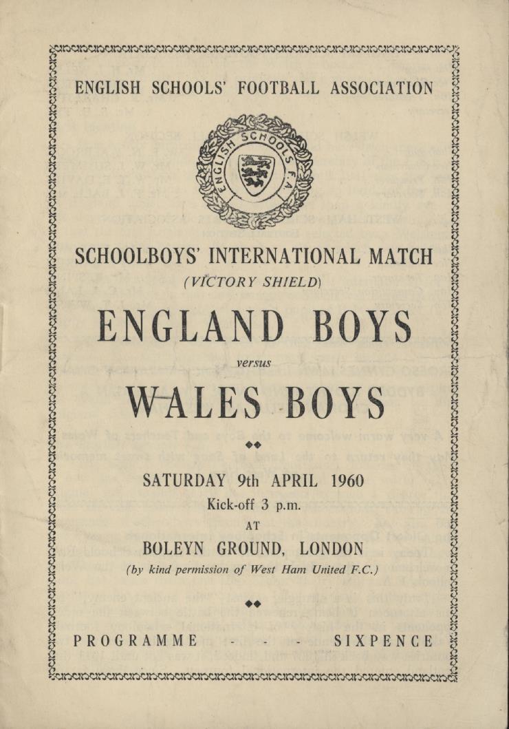 Official programme for the match between England Schools and Wales Schools at Boleyn Ground on 9th April 1960. Terry Venables represented England.