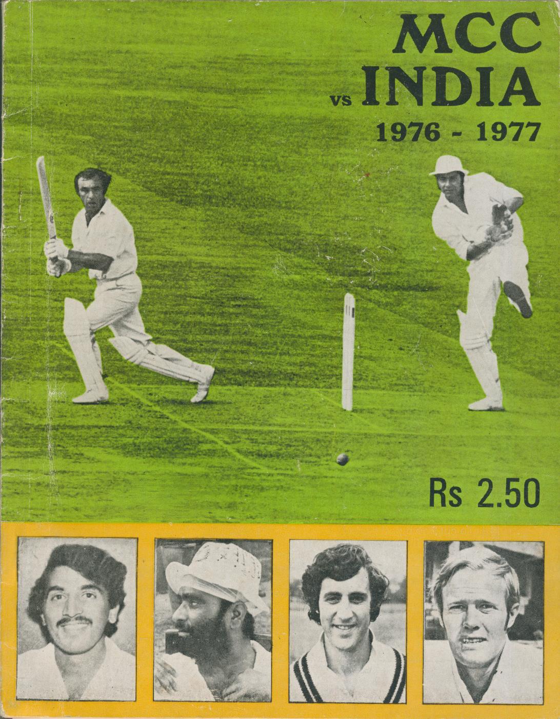 Cricket brochure for the England (MCC) tour to India in 1976-77. Includes pen and photographic portraits of players on both teams, articles and a comprehensive statistical section (not including this tour).