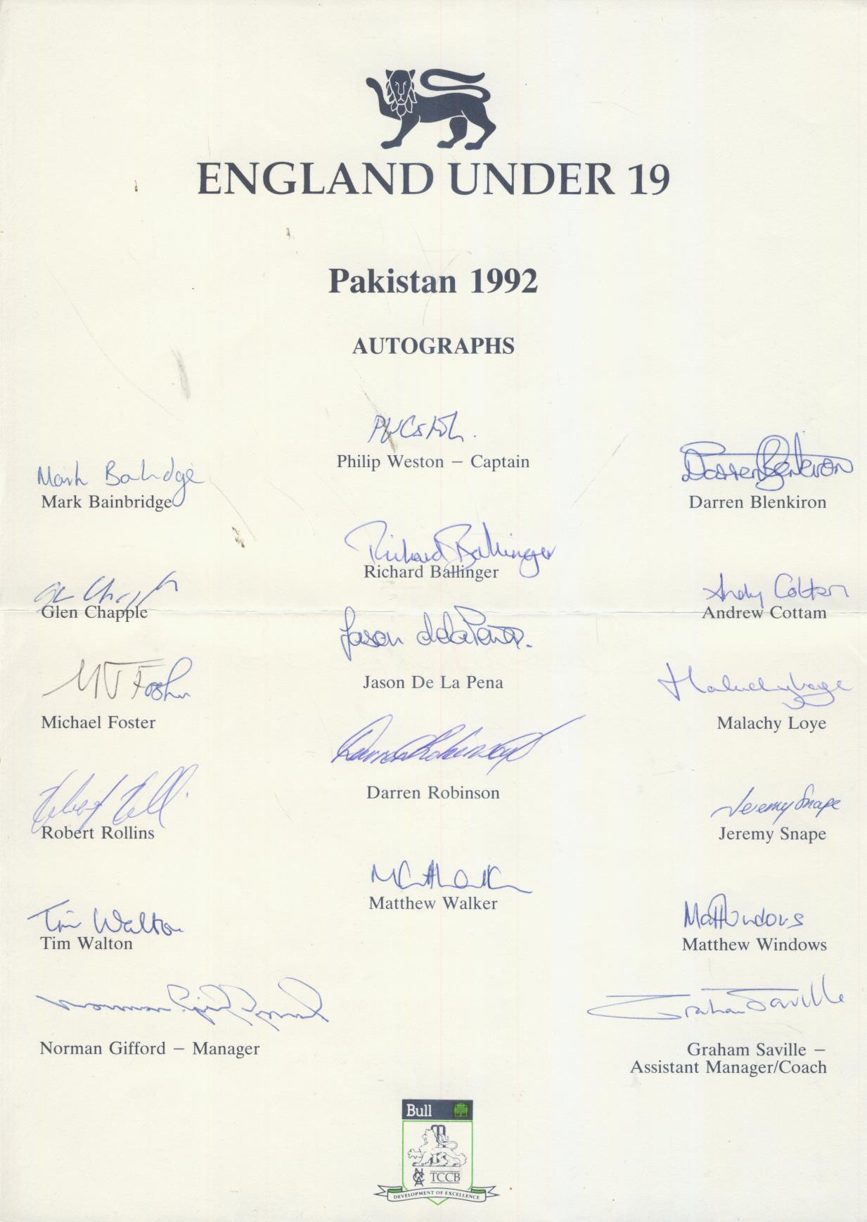 Official team sheet for the England Under 19 tour of Pakistan. Fully signed, including Weston, Chapple, Robinson, Loye, Snape, Windows and Norman Gifford, the coach.