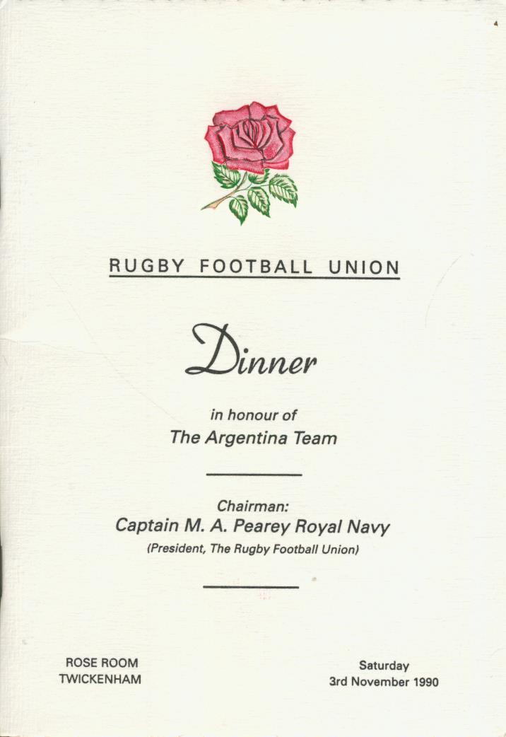 Menu of the dinner in honour of the touring Argentina Team at Twickenham, 3 November 1990.