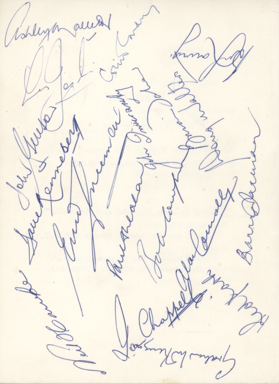 Single folded card. 17 x 13cm. Very good condition. Signed to the reverse by all 17 Australian tourists, including Lawry, Mallett, Renneberg, Gleeson, Connolly, Hawke, Ian Chappell, Jarman, Redpath, McKenzie, Walters, Taber, Inverarity, Sheahan, Cowper, Freeman and Joslin. Also signed to reverse by Colin Cowdrey, the England captain, and inside by Sir Robert Menzies, who gave a toast.