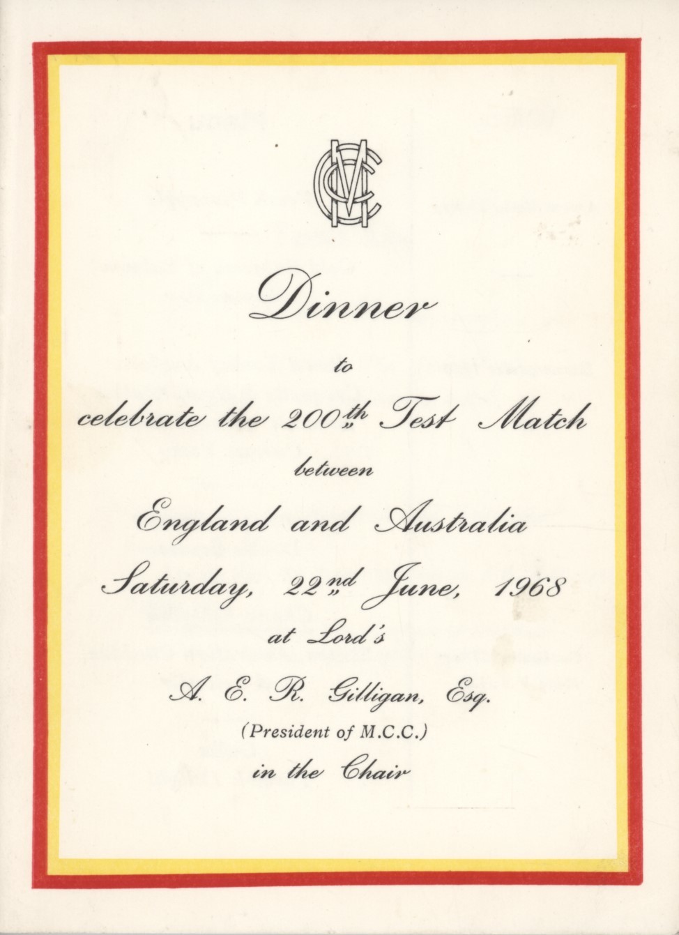 Menu card for a dinner held to celebrate the 200th Test Match between England and Australia at Lord's on June 22nd, 1968.