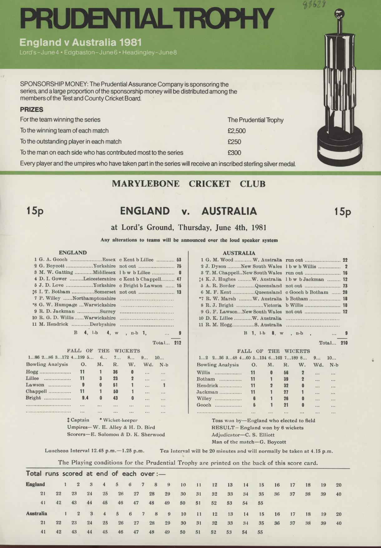 ENGLAND V AUSTRALIA 1981 (LORD'S) PRUDENTIAL TROPHY CRICKET SCORECARD