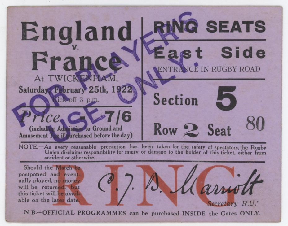Original ticket for the match played at Twickenham on February 25th, 1922. The match was drawn 11-11 and was the first time that France had avoided defeat against England.