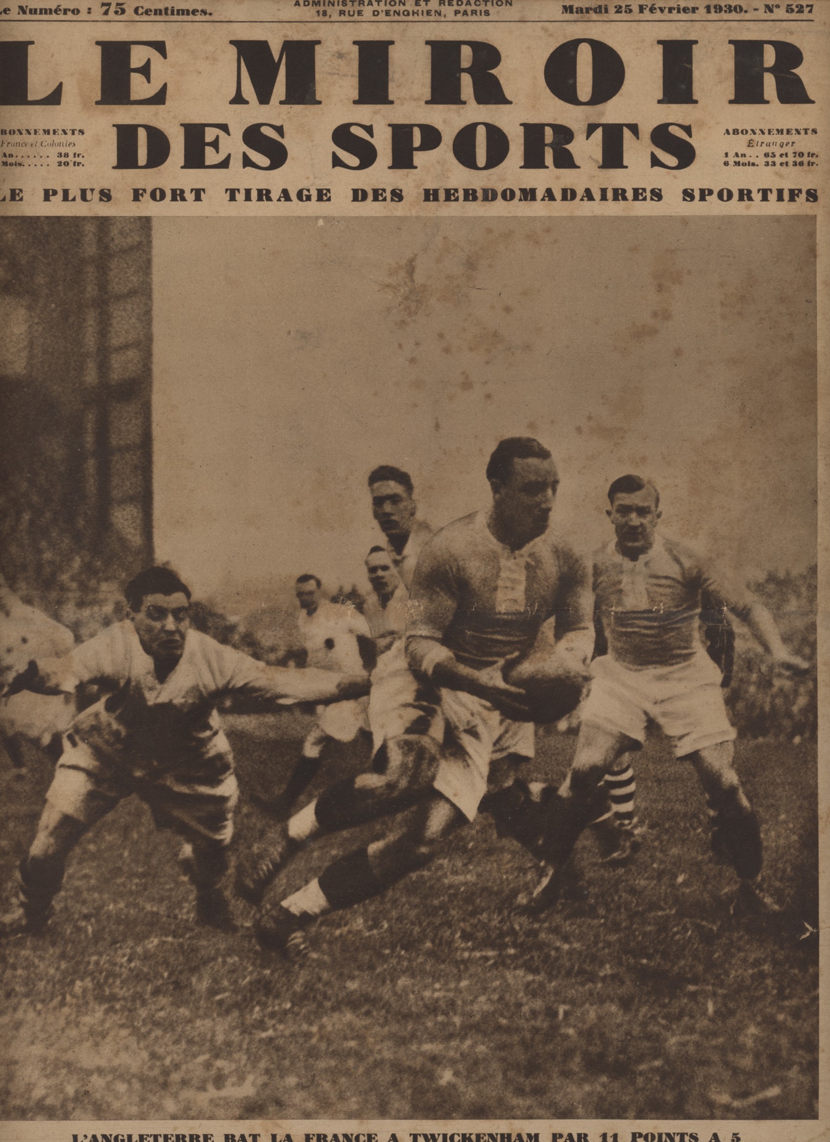 Copy of "Le Miroir Des Sports" newspaper for February 25th 1930, with pictures and full reports (in French) of the England – France match at Twickenham, won by England 11-5. Includes match report and photographs of action from the match and the French team relaxing at the Star and Garter Hotel in Richmond, SW London.